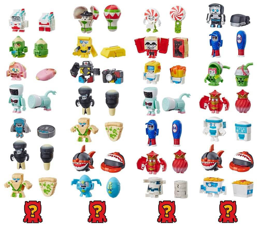 8 stycken små minirobotar. Varje paket innehåller 8 robotar men innehållet varierar i varje förpackning. Varje förpackning innehåller en av de fyra uppsättningarna som visas på bild 2. Det går inte att på förhand bestämma vilken av dessa fyra uppsättningar som levereras.