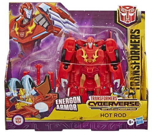 Combine Transformers Cyberverse Ultra Hot Rod with Energon Armor to convert him into his powered-up mode. Pull out his Ion X-Bow weapon in the last conversion step to activate his Energon Armor-Up feature. Armor attaches automatically! Ages 6 and up, stands about 17 cm tall.