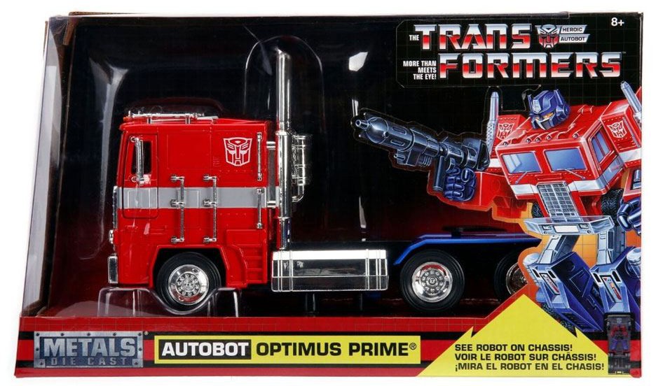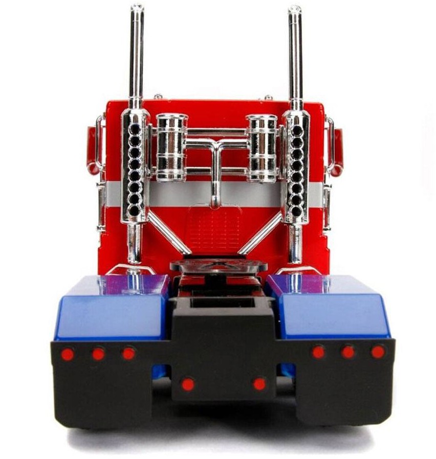 The 10-wheeler features real rubber tires and a sleek paint deco of Optimus Prime's red and blue paint scheme with shiny chrome.