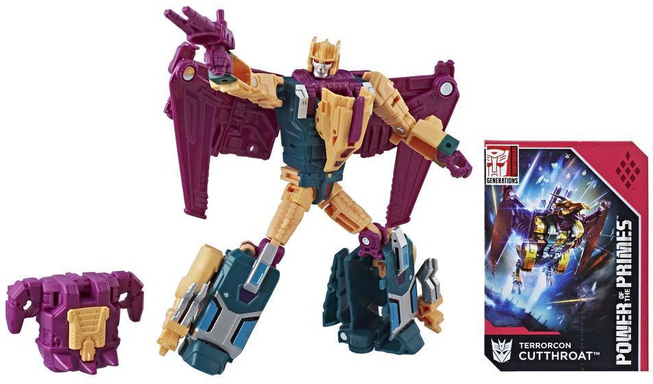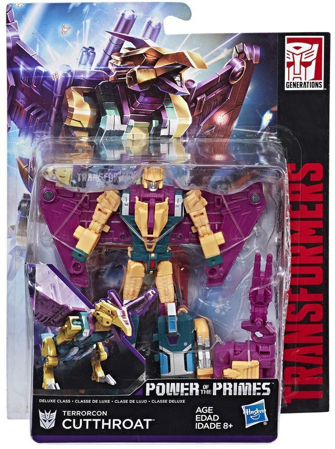 Transformers Generations Power of the Primes Deluxe Class figures are 5.5-inch-scale figures that come with a Prime Armor accessory. Insert a Prime Master figure (not included, each sold separately) into the accessory, attach it to the figure's chest, and imagine Terrorcon Cutthroat wields the power of a Prime.