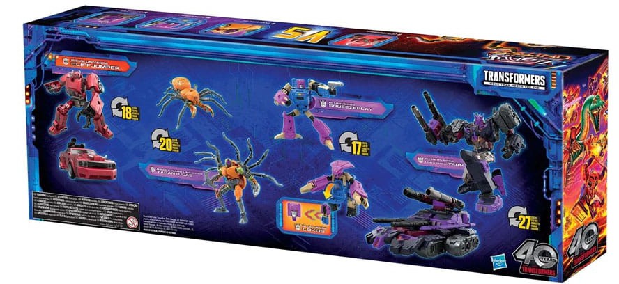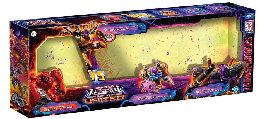 Unite your favorite characters from across the world of Transformers robots into your collection with the Transformers Legacy United Multipack! Beast Wars Tarantulas 5.5-inch (14cm) action figure converts between robot mode and spider mode in 20 steps. Prime Universe Cliffjumper 5.5-inch (14cm) action figure converts between robot mode and car mode in 18 steps. G1 Universe Squeezeplay 5.5-inch (14cm) action figure converts between robot mode and beast mode in 17 steps. Cyberverse Universe Tarn 7-inch (17.5cm) action figure converts between robot mode and tank mode in 27 steps. They feature articulated head, arms, and legs for awesome action poses. Celebrate the last 40 years of Transformers history with Transformers Legacy action figures. Transformers Legacy opens the portal to a whole new universe of -- More Than Meets the Eye -- bringing together every Transformers generation like you've never seen before. Collect and combine different characters to create your ideal Legacy lineup.