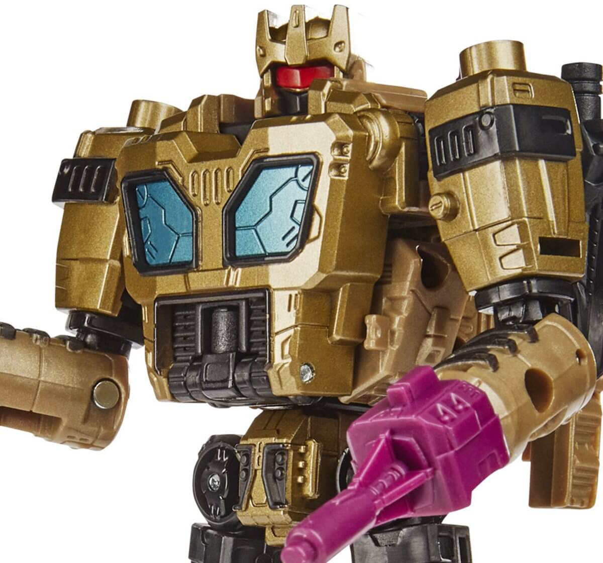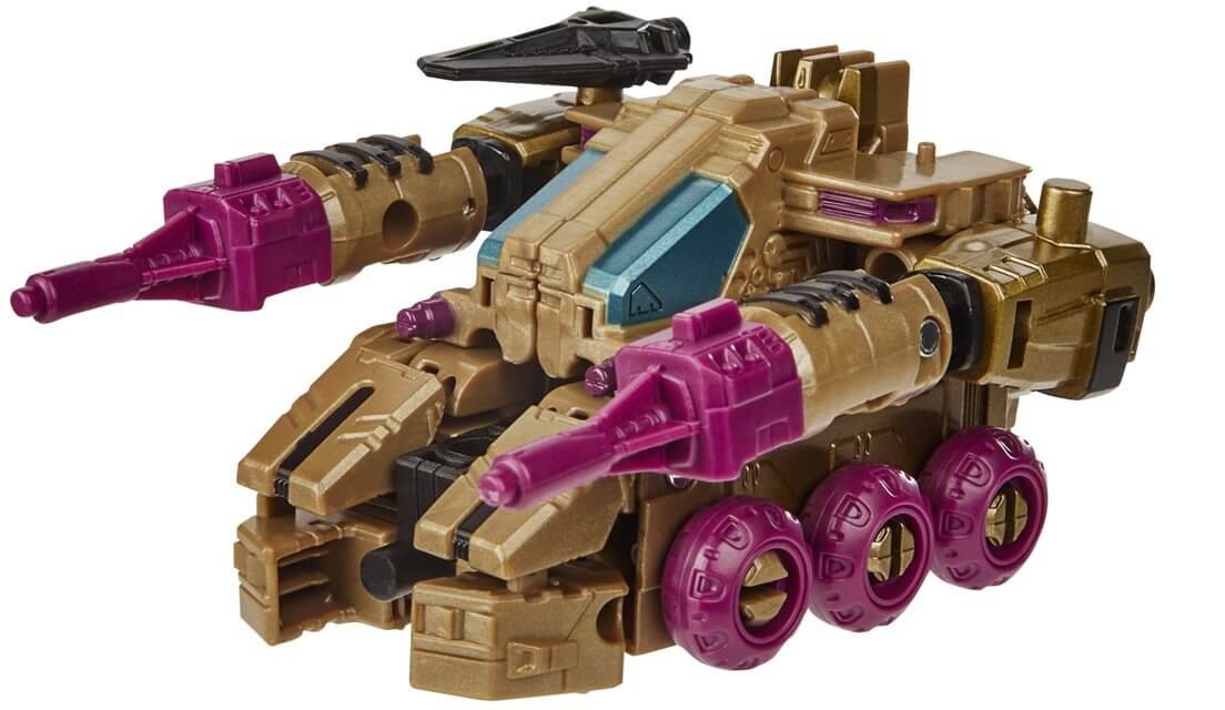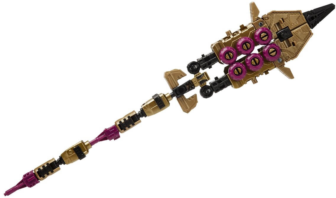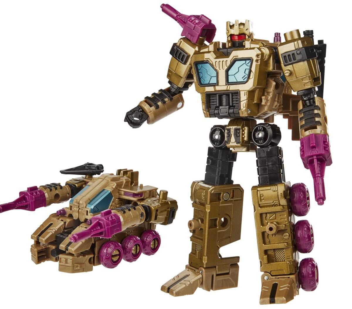 This special edition WFC-GS22 Black Roritchi figure features gold deco inspired by the Fasttrack Headmaster redeco included with the 1988 Super-God Masterforce BlackZarak. This Black Roritchi figure converts from robot to tank mode in 10 steps, then breaks apart into weapons and armor in 7 steps. Also converts into a staff that can be held by Titan Class figures (sold separately, subject to availability). Comes with 2 blaster accessories that can attach to the figure in robot and tank modes.