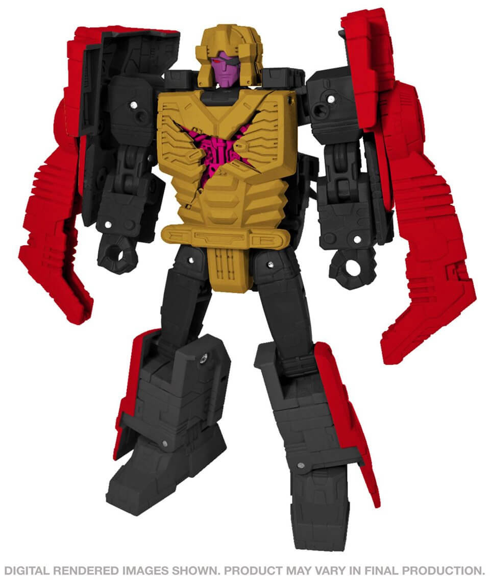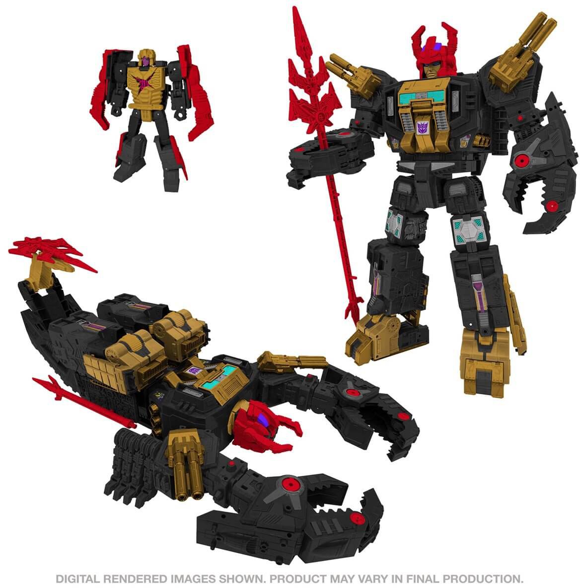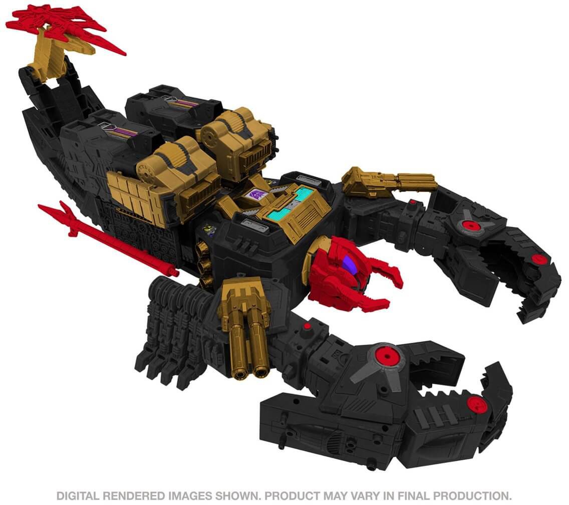 This Black Zarak figure is inspired by the original 1988 toy release, based on the Super-God Masterforce cartoon. The figure converts from robot to base mode in 39 steps then to scorpion mode in 33 steps. Figure comes with classic Tyrant Spear and shield accessories, plus shoulder cannon details. Spear accessory breaks apart into pieces that can store on the figure’s sides in scorpion mode. Head of spear accessory attaches to tail in scorpion mode. Shield accessory attaches to figure’s arm in robot mode. This Black Zarak figure’s head converts into a Deluxe-scale figure featuring battle-damage deco. Remove the head of the Deluxe-scale figure and convert to an additional smaller figure.