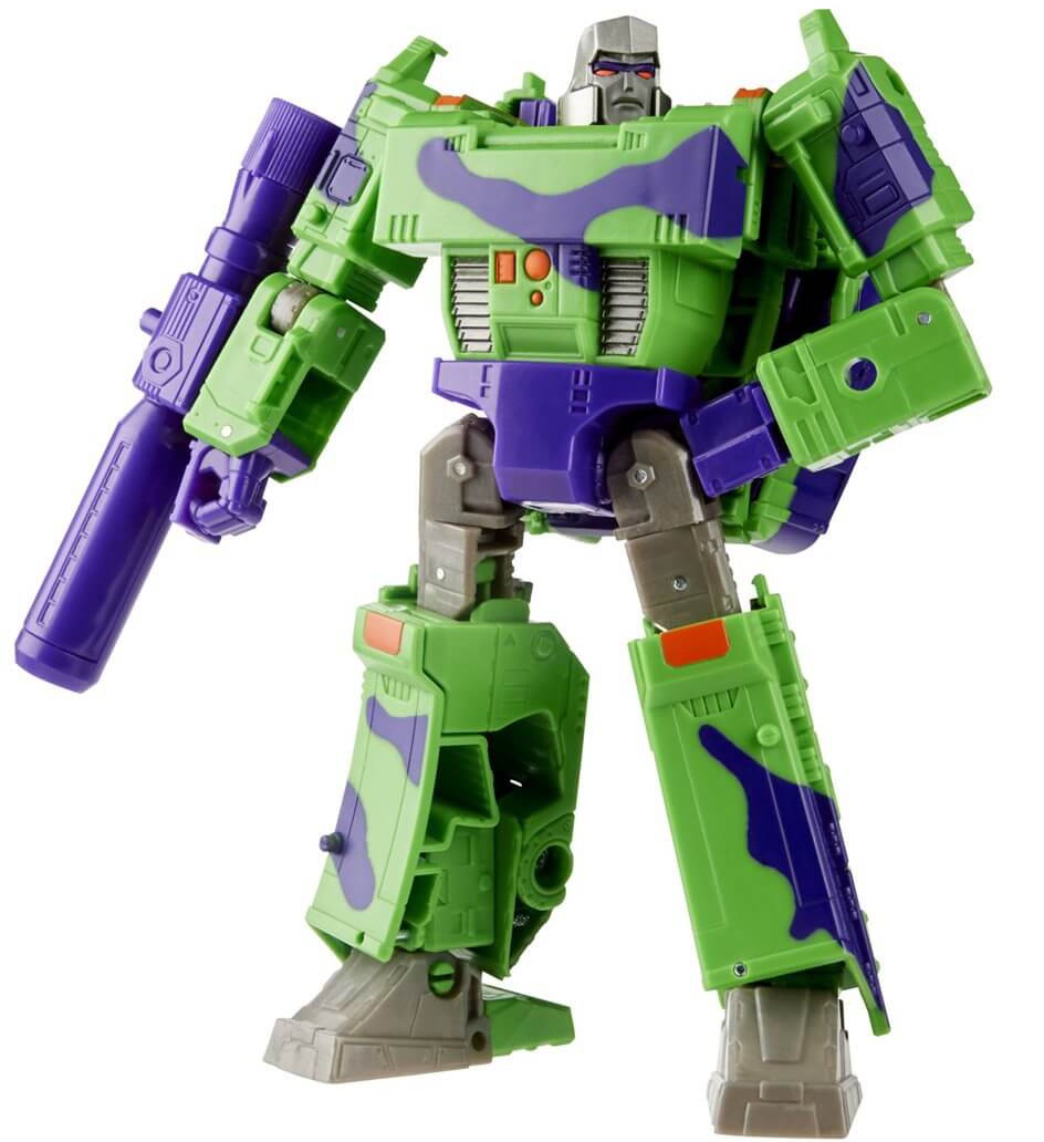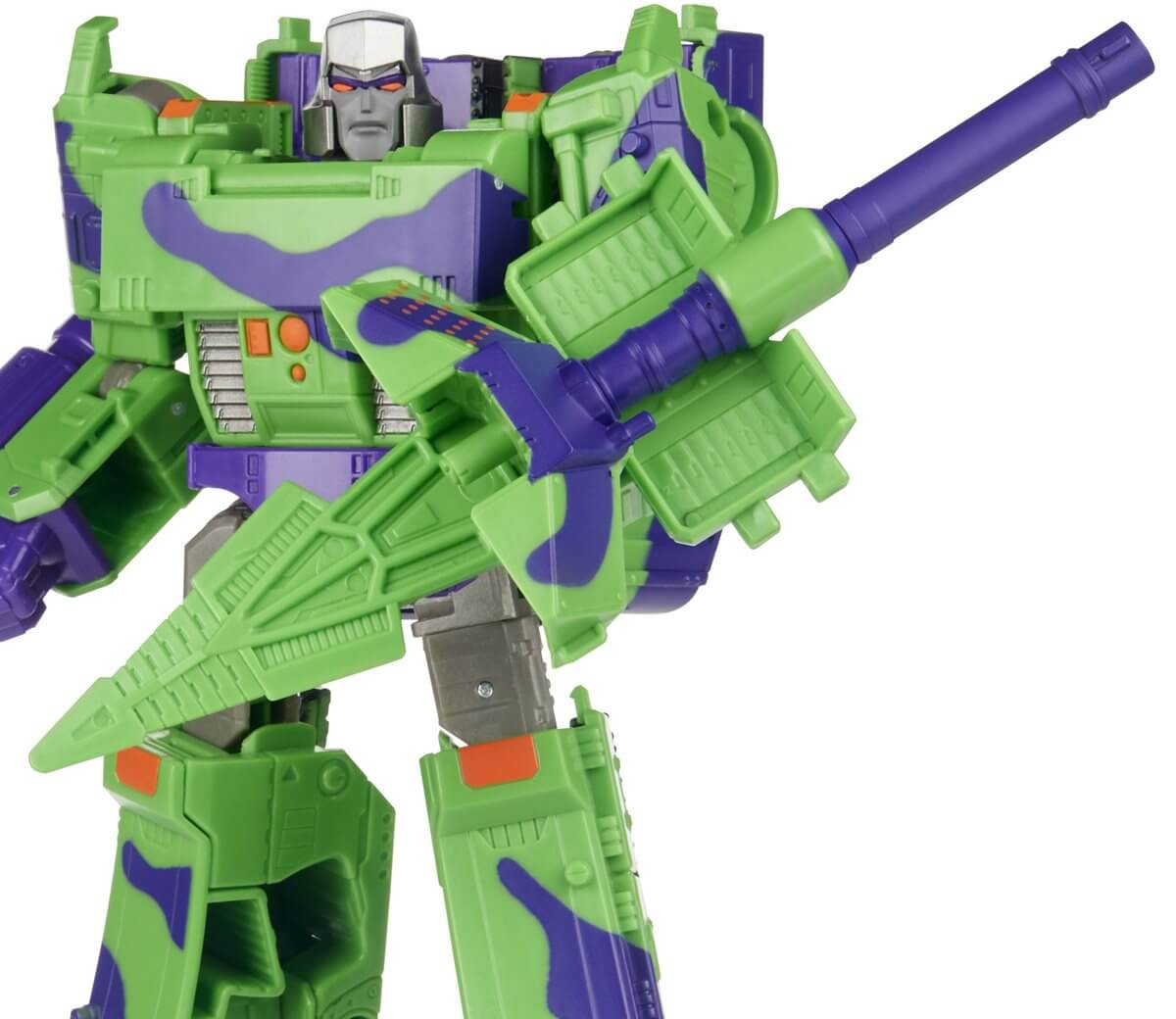 This special edition WFC-GS14 Megatron figure is inspired by the 1992 G2 toy release, featuring purple and green camouflage deco inspired by the original release. This G2 Megatron figure converts from robot to tank mode in 21 steps and comes with sword and fusion cannon accessories that attach to the figure in robot and tank modes.
