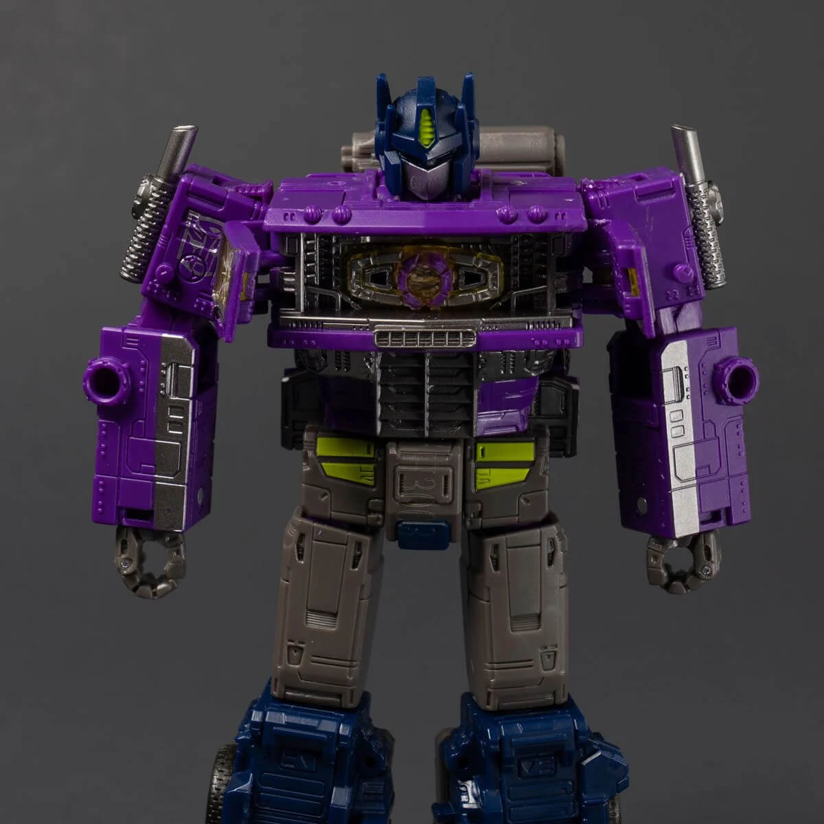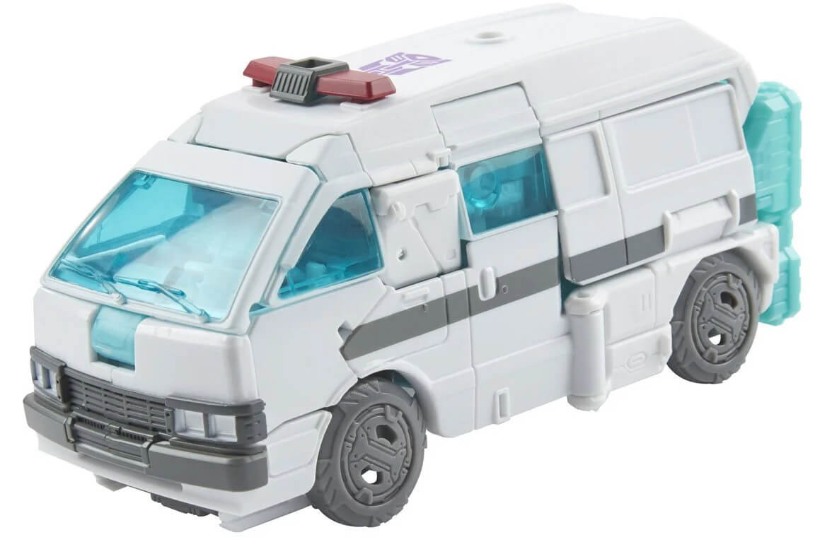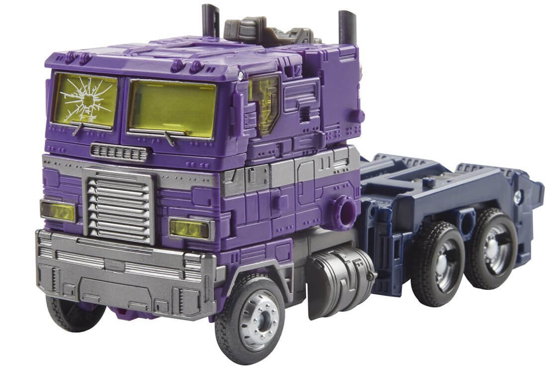 These special edition WFC-GS17 Shattered Glass Ratchet and Optimus Prime figures are inspired by the Shattered Glass comics created in partnership with IDW which depict an alternate universe where the heroic Decepticons battle the evil Autobots. These figures depict the sadistic Autobot leader and the deranged Autobot medic with comic-inspired deco, featuring purple Autobot logos.