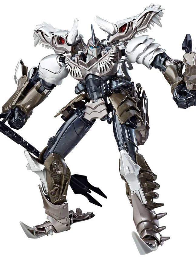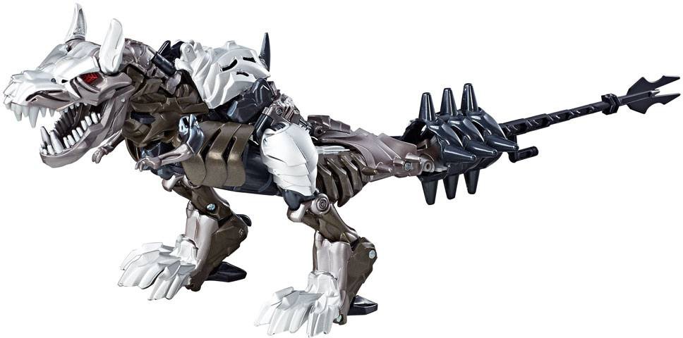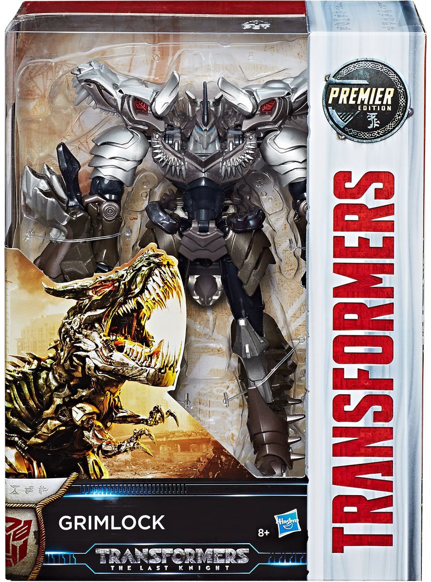 The legendary action comes to life with Transformers: The Last Knight Premier Edition Voyager Class figures. This Premier Voyager Grimlock figure converts from robot to T-rex in 18 steps and comes with battle mace accessory.