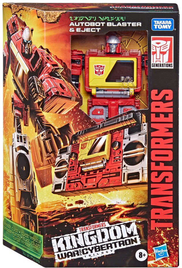 War for Cybertron: Kingdom Voyager WFC-K44 Autobot Blaster & Eject är G1-inspirerad. Blaster förvandlas till klassiskt G1-inspirerat radioläge i 20 steg och kommer med ett blastertillbehör. Eject konverterar från robot- till kassettläge i 8 steg och får plats i Autobot Blaster-figurens bröst. Figuren inkluderar ett Golden Disk-kort som avslöjar ett eventuellt öde för en nyckelkaraktär. Samla andra Kingdom-figurer för att avslöja alla tre alternativa ödesvarianter för varje karaktär!