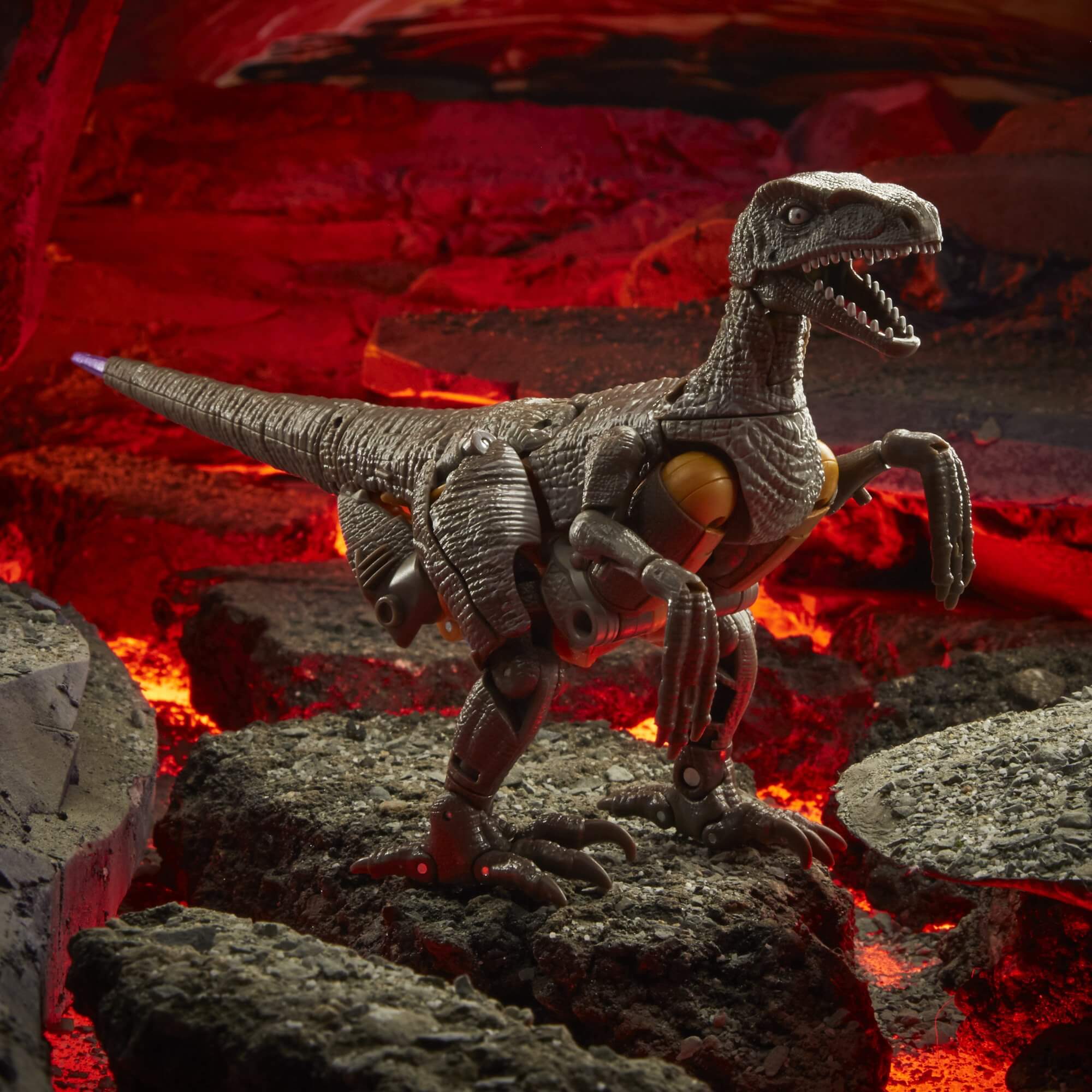 Unleash the primal power of the beasts with this Dinobot collectible figure, featuring a detailed beast mode with intricate molded dinosaur scale texture. Toy converts to Beast Wars-inspired raptor mode in 28 steps and features articulated claws and a posable jaw for realistic velociraptor poses. Tail detaches from raptor mode during conversion and becomes his Cyber Slash tail weapon and sword accessories. No matter the weapon or the foe, Dinobot always fights with honor.