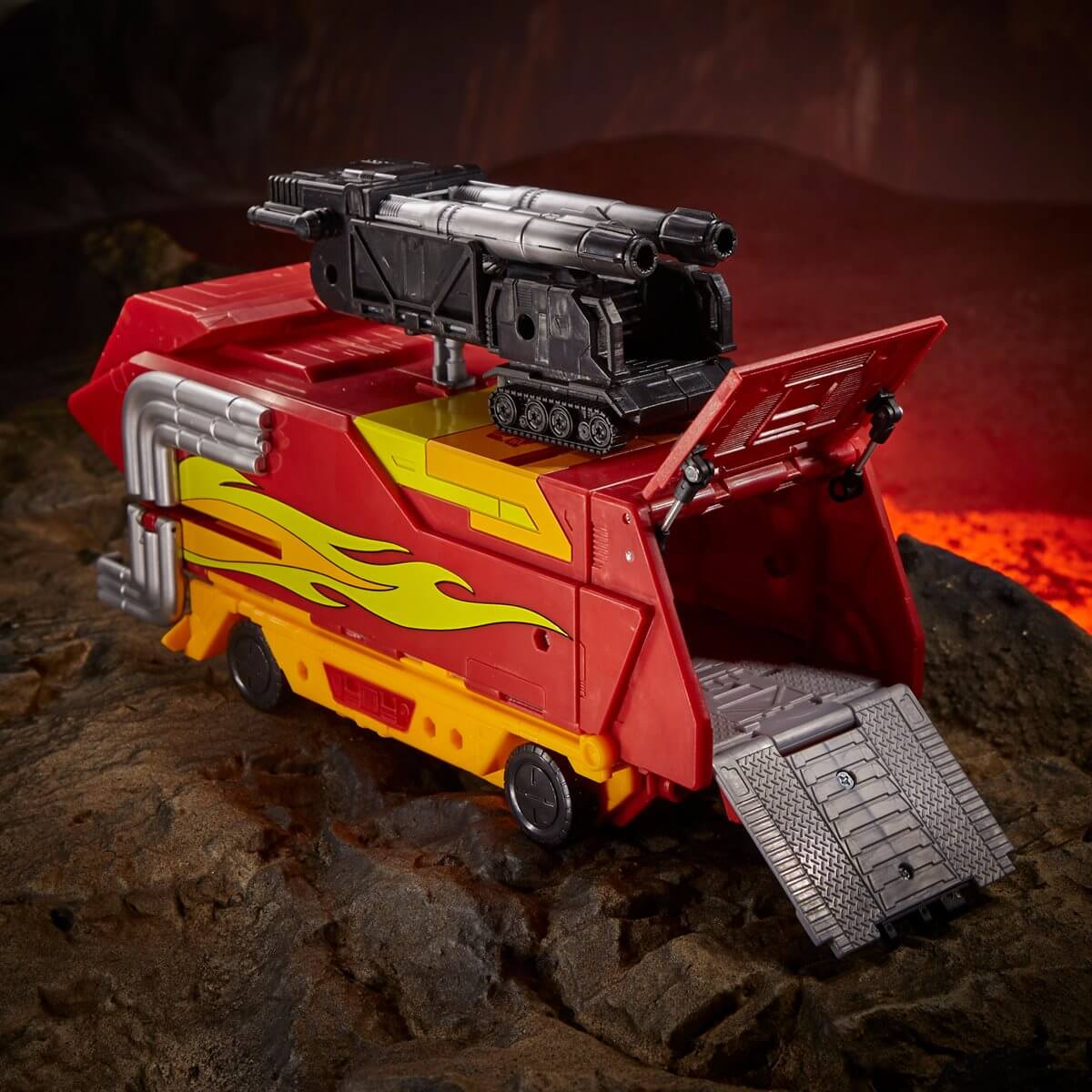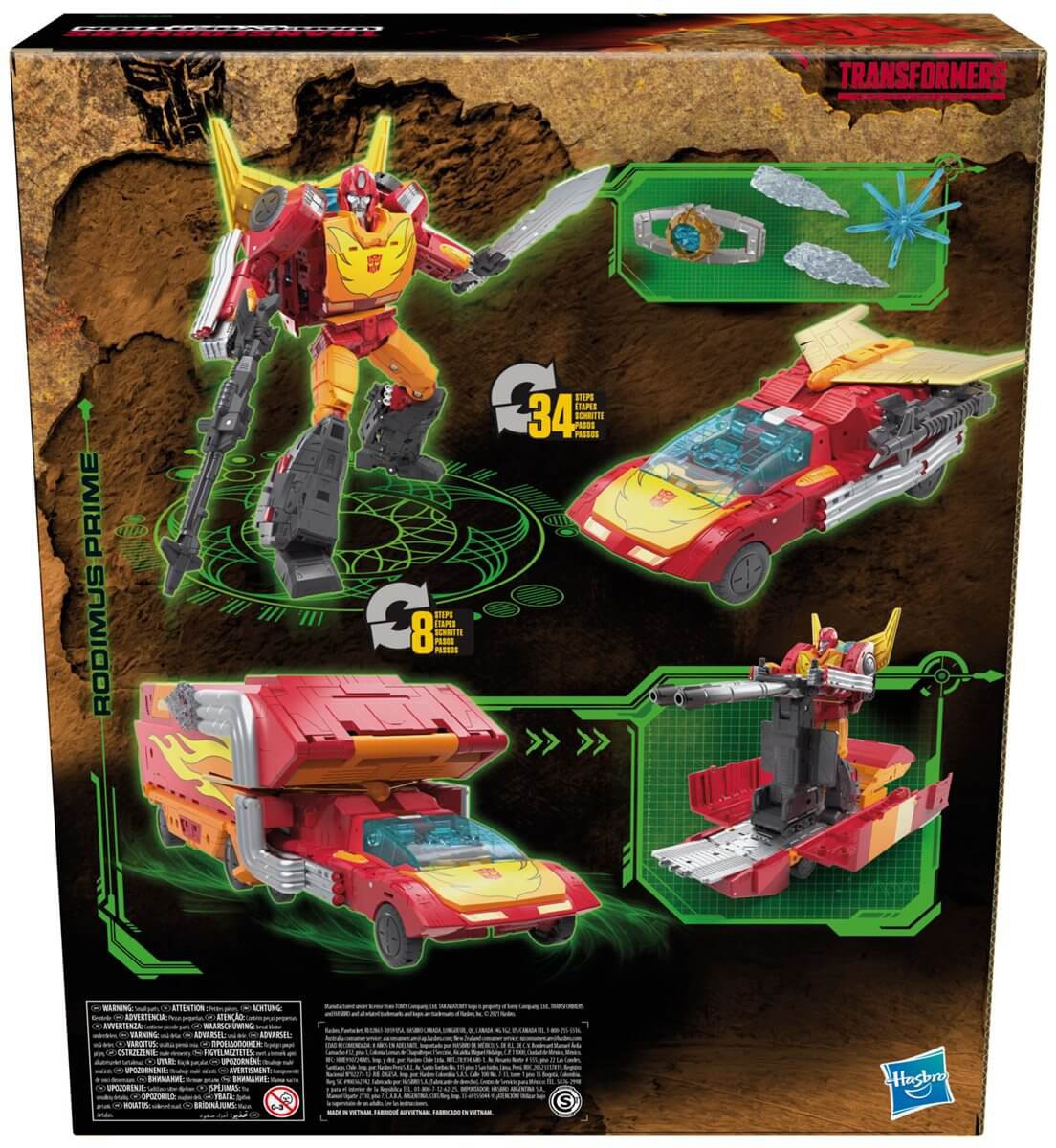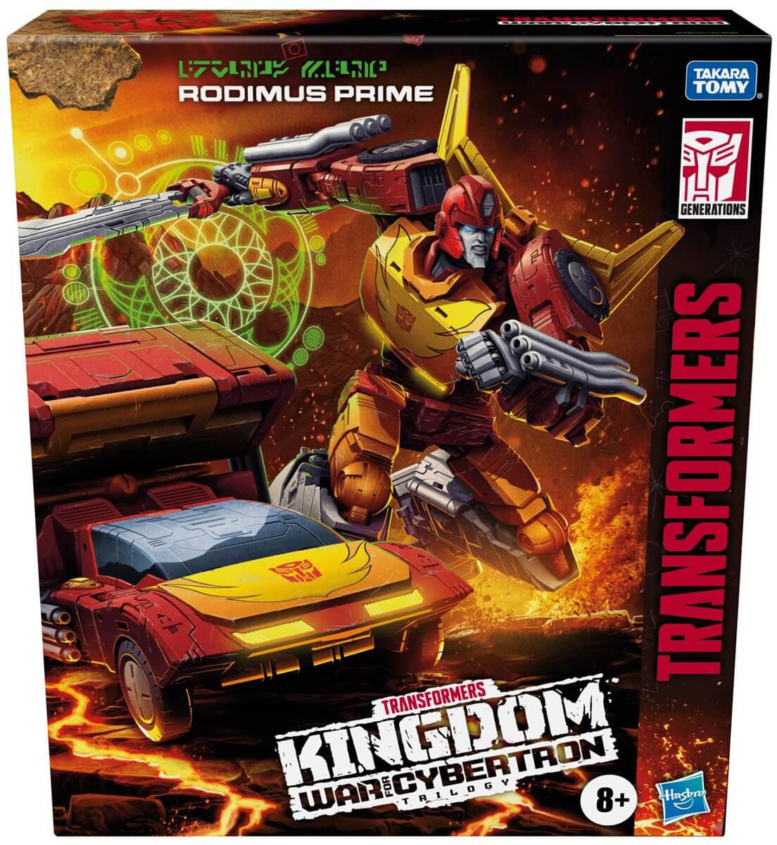 Kingdom War for Cybertron Commander Class Rodimus Prime förvandlas från robot till sportbil i 34 steg och sedan till lastbil i 8 steg. Flaket kan transportera Deluxe Class figurer.
