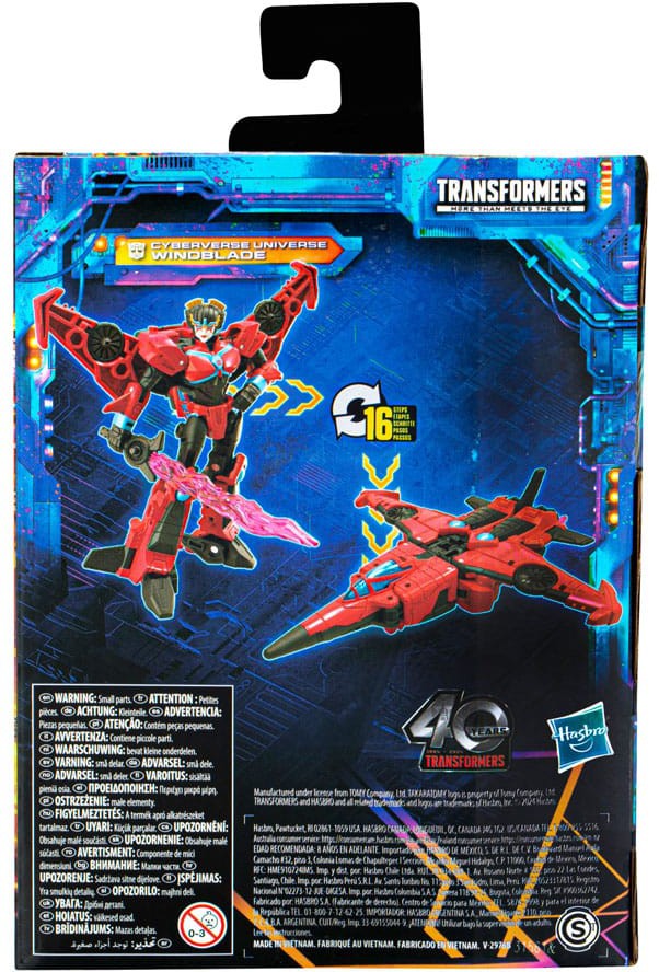 Förena dina favoritkaraktärer från hela världen av Transformers-robotar i din samling med actionfiguren Transformers Legacy United Deluxe Class Cyberverse Universe Windblade! Denna 14 cm höga Cyberverse Universe Windblade actionfigur omvandlas mellan robot- och jetlägen i 16 steg. Gör dig redo för strid med det medföljande Stormfall-svärdet och tillbehör för fläktblad. Cyberverse Universe Windblade-figuren är inspirerad av karaktären från den animerade serien Transformers: Cyberverse och har ledat huvud, armar och ben för häftiga actionposeringar.