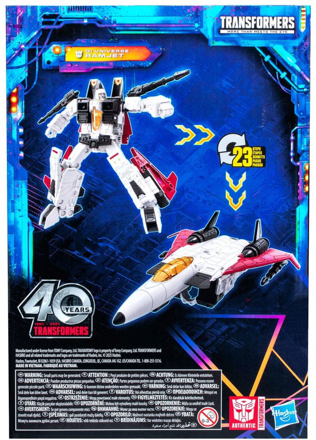 Unite your favorite characters from across the world of Transformers robots into your collection with the Transformers Legacy United Voyager Class G1 Universe Ramjet action figure! This 7-inch G1 Universe Ramjet action figure converts between robot and jet modes in 23 steps. Gear up for battle with the included blaster accessories that attaches in robot and jet modes. The G1 Universe Ramjet figure is inspired by the character from the Transformers: Transformers G1 animated series and features articulated head, arms, and legs for awesome action poses. Celebrate the last 40 years of Transformers history with Transformers Legacy action figures. Transformers Legacy opens the portal to a whole new universe of -- More Than Meets the Eye -- bringing together every Transformers generation like you've never seen before. Collect and combine different characters to create your ideal Legacy lineup.