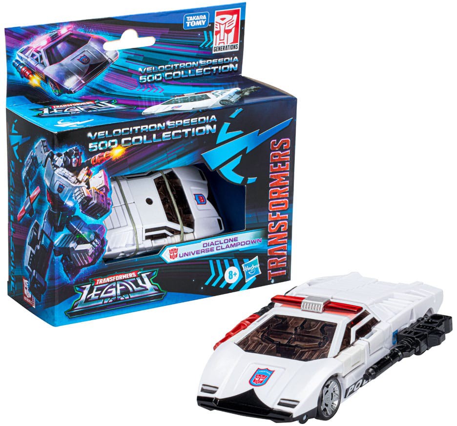 Universes collide! Transformers: Legacy brings together fan-favorite characters from across the Transformers multiverse. Figures feature deco inspired by their universe with an updated Generations design. In honor of the almost 40-year legacy of Transformers entertainment, the fandoms come together from across the Transformers multiverse, all in one toy line. The race is on! Bots from across the multiverse have gathered on Velocitron to participate in the Speedia 500, a planet-wide race to determine its next leader. Clampdown knows the Speedia 500 is happening, but that doesn't mean bots can get away with speeding. He sits on the roadside, waiting to pull over bots racing above safe speed limits.
