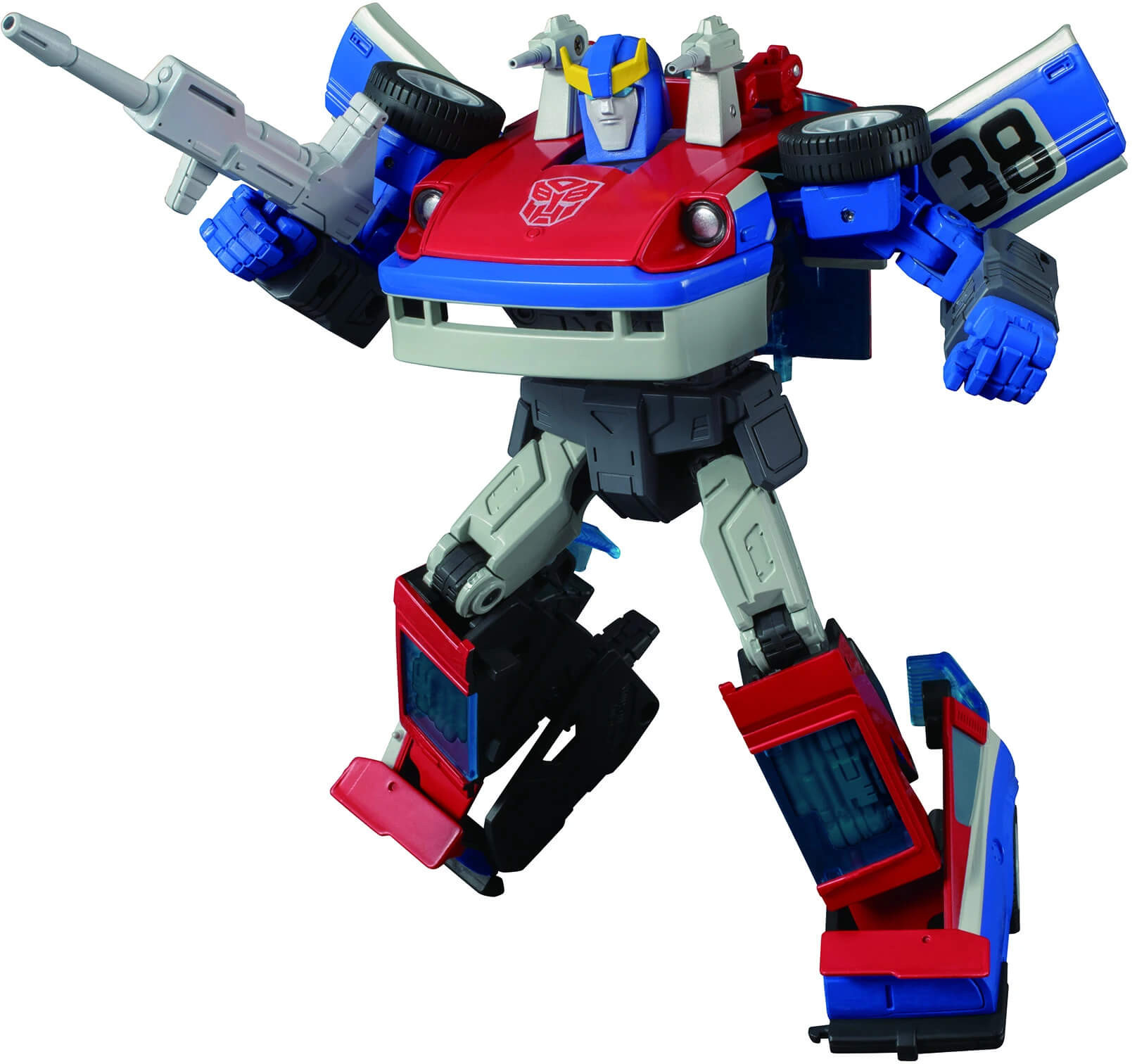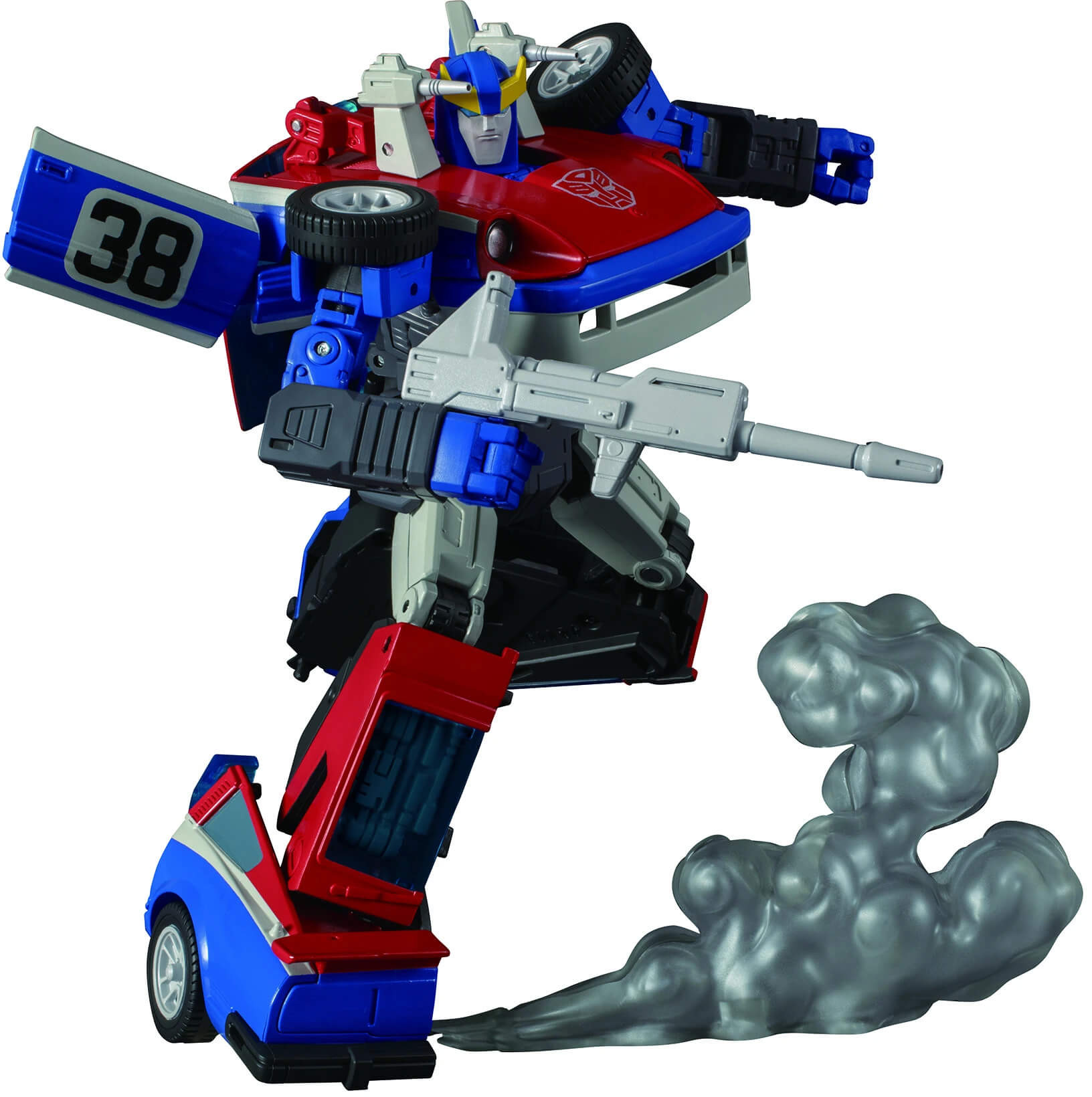 MP-19+ Smokescreen includes a Smoke Effect that was not included in previous version, 2 interchangeable cartoon-inpsired face expressions, a Disruptor Rifle, and 2 Jamming Launchers. The fully-jointed figure features highly complex conversion from robot to sports car mode.