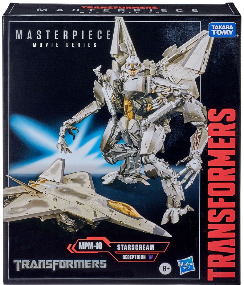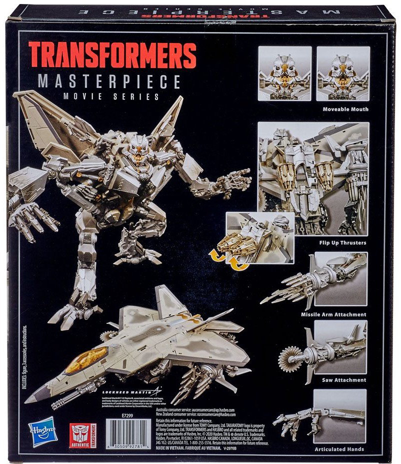 In the first Transformers live action movie, Starscream attempts to capture the Allspark, disguising himself as an F-22 fighter jet to launch a surprise attack against Sam Witwicky and the Autobots. This MPM-10 Starscream figure converts from the screen-accurate official Lockheed Martin F-22 Raptor Jet to robot mode in 63 steps. Figure includes highly articulated hands, flip up thrusters, moveable mouth, and missile and saw arm attachments and Gatling blaster accessories.