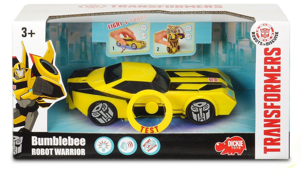 This Transformers Robots in Disguise Warriors Class Bumblebee Figure converts fast from robot mode to sports car mode. Including Sound and Light-Up Effects. Measures approx. 15 cm long and comes in a window box with Try-Me Function.