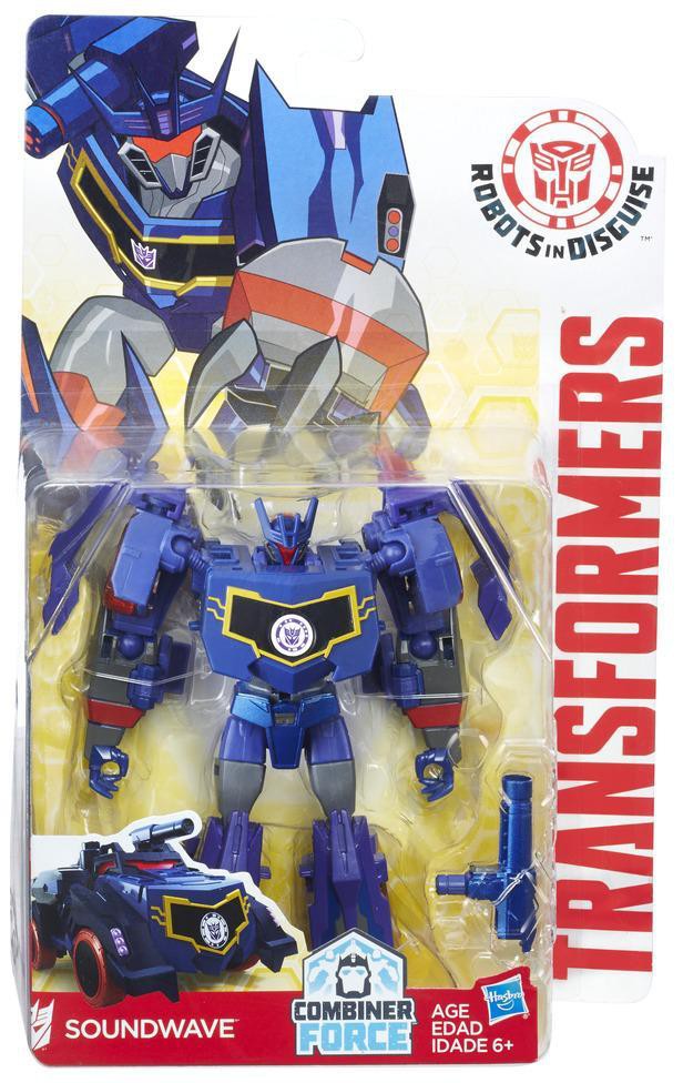 Collectible Transformers: Robots in Disguise Combiner Force Warriors Class figures are larger-scale figures that feature classic Transformers conversion and awesome weapon accessories. Change this Warriors Class Soundwave figure between robot and tank in 14 steps. Figure comes with 1 blaster accessory. Scan the Decepticon shield on this Soundwave figure to unlock a token in the mobile app.