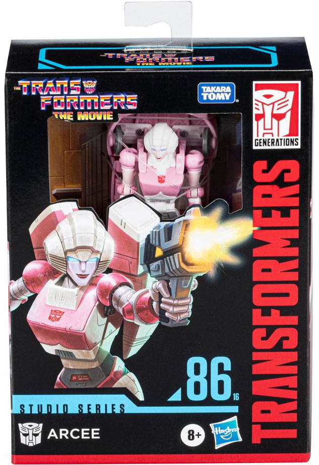 This Studio Series 86-16 Deluxe Class Transformers: The Movie-inspired Arcee figure converts from robot to Cybertronian car mode in 18 steps. Remove backdrop to showcase Arcee toy in the Battle of Autobot City scene. In the Battle of Autobot City scene from The Transformers: The Movie, Arcee converts Autobot City when the Decepticons launch their attack. Pose the figure out with the included blaster accessory and imagine re-creating this classic movie moment!