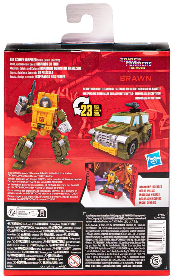 Bring the epic action of the Transformers movies from the big screen into your collection with the Transformers Studio Series Deluxe Class 86-22 Brawn action figure, inspired by The Transformers: The Movie! In an effort to protect the crew, Brawn is the first to act when Decepticons attack the Autobot shuttle. Transformers Studio Series toys are collectible action figures for 8 year old boys and girls that feature movie-inspired details and accessories. Convert the action figure from robot to off-road vehicle mode in 23 steps and pose the Brawn toy in the included Decepticon Shuttle Ambush removable backdrop scene. Transformers action figures for boys and girls make great gifts!