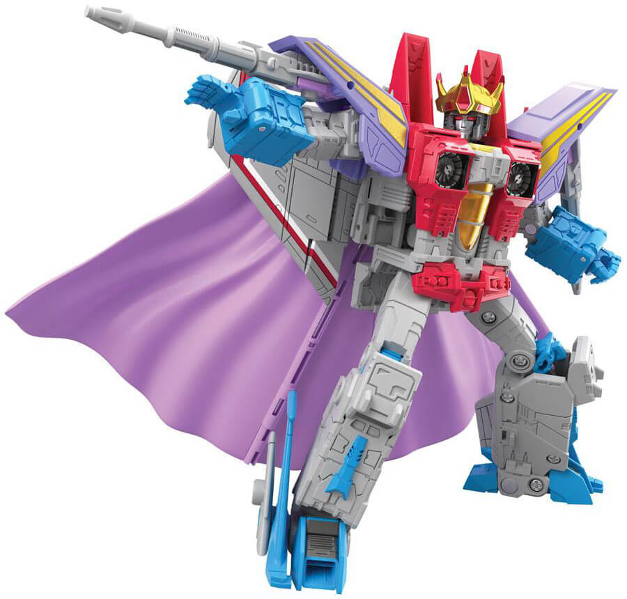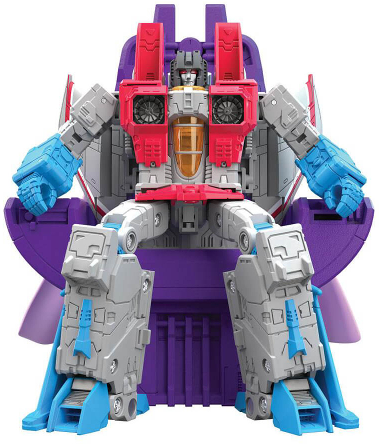 This Studio Series 86-12 Leader Class The Transformers: The Movie-inspired Coronation Starscream figure converts from robot to jet mode in 29 steps. Comes with 2 null rays, 2 shoulder armor pieces, crown, cape, and throne accessories. Remove backdrop to showcase the Coronation Starscream figure in the All Hail Starscream scene. In the All Hail Starscream scene, Starscream holds a coronation asserting his rise as king of the Decepticons, until Galvatron disrupts the proceedings and ruins his big day. Pose the figure out and re-create this classic movie moment!
