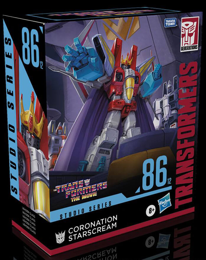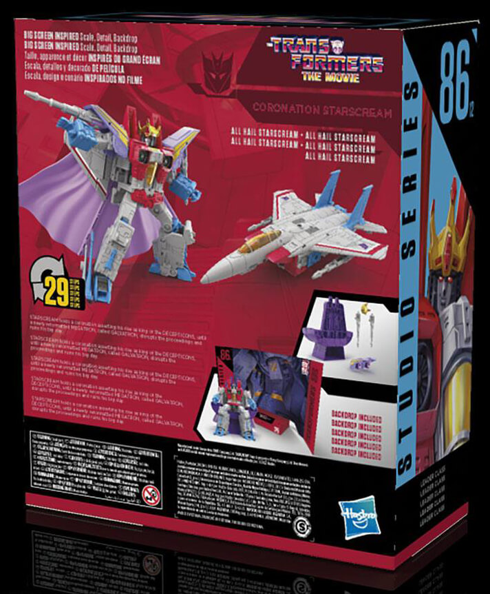 Denna filminspirerade Leader Class Studio Series 86-12 Coronation Starscream konverterar från robot till jetläge i 29 steg. Levereras med två null beams, två axelplattor, en krona, cape och trontillbehör. Ta bort bakgrunden för att visa upp Coronation Starscream-figuren i All Hail Starscream-scenen. I All Hail Starscream-scenen håller Starscream en kröning och gör sig till kung av Decepticons, tills Galvatron avbryter förfarandet och förstör hans stora dag.