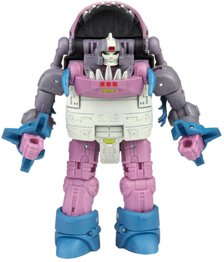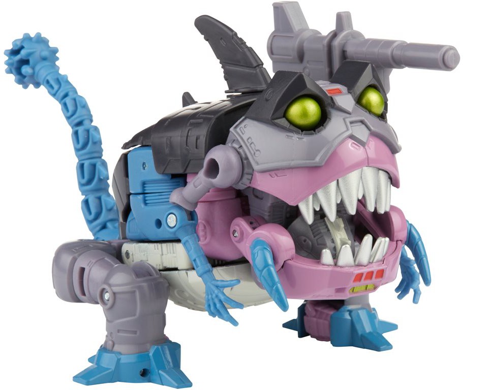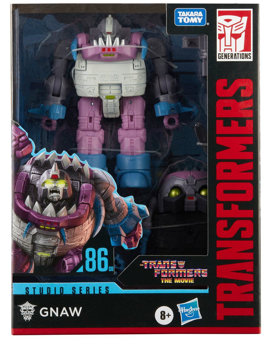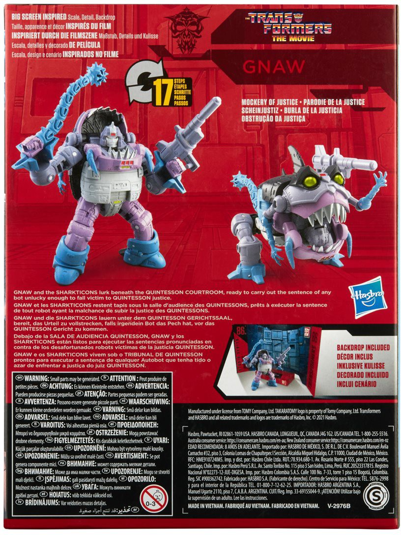 This Studio Series 86-08 Deluxe Class The Transformers: The Movie-inspired Gnaw figure converts from robot to Sharkticon mode in 17 steps. Remove backdrop to showcase Gnaw in the Mockery of Justice scene. In the Mockery of Justice Scene from The Transformers: The Movie, Gnaw and the Sharkticons lurk beneath the Quintesson Courtroom, ready to carry out the sentence of any bot unlucky enough to fall victim to Quintesson justice.