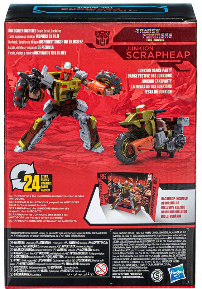 Bring the epic action of the Transformers movies from the big screen into your collection with the Transformers Studio Series Voyager Class Junkion Scrapheap action figure, inspired by The Transformers: The Movie! Transformers Studio Series toys are collectible action figures that feature movie-inspired details and accessories. Convert the Studio Series Transformers action figure from robot to motorcycle mode in 24 steps and pose the Junkion Scrapheap toy in the included Junkion Dance Party removable backdrop scene. Look for more Transformers Studio Series collectible figures to build a movie-inspired collection!