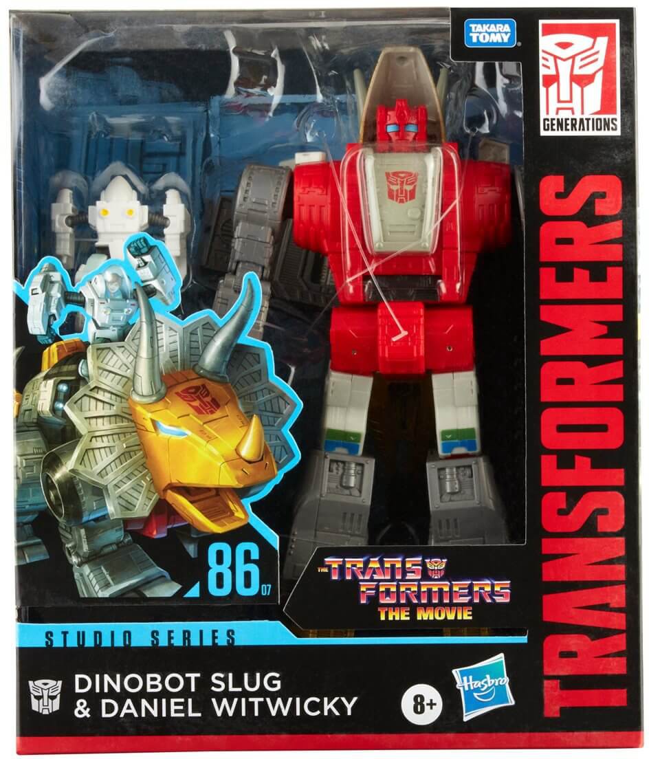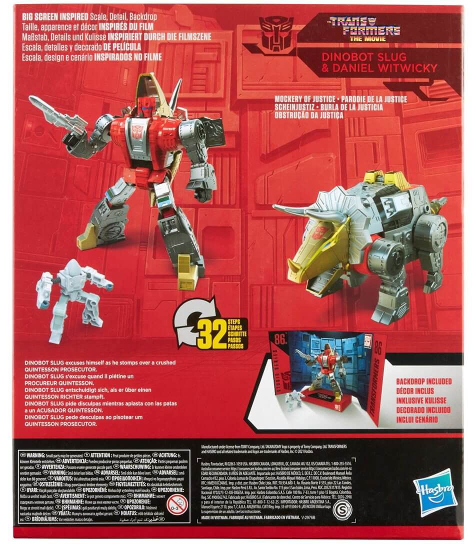 This Studio Series 86-07 Leader Class The Transformers: The Movie-inspired Dinobot Slug figure converts from robot to triceratops mode in 32 steps. Includes non-converting Daniel Witwicky figure that can sit on Dinobot Slug figure in both modes. Remove backdrop to showcase Dinobot Slug and Daniel Witwicky in the Mockery of Justice scene. In the Mockery of Justice scene, the Dinobots storm the Quintesson Courtroom to save Hot Rod and Kup, as Slug stomps over a crushed Quintesson prosecutor. Pose the figures out and re-create this classic movie moment!