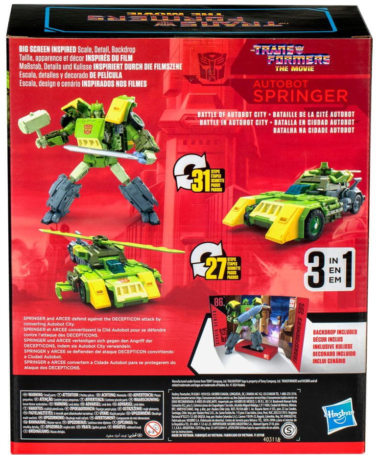 Bring the epic action of the Transformers movies from the big screen into your collection with the Transformers Studio Series Leader Class Springer action figure, inspired by The Transformers: The Movie! Transformers Studio Series toys are collectible action figures that feature movie-inspired details and accessories. Convert the Studio Series Transformers action figure for 3-in-1 play! The figure converts from robot to Cybertronian tank mode in 31 steps, then to Cybertronian helicopter mode in 27 steps. Pose the Springer toy in the included Battle of Autobot City removable backdrop scene.