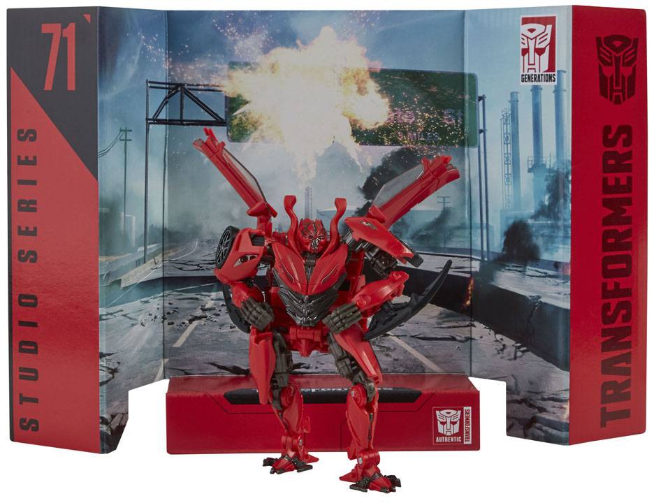 This Studio Series 71 Deluxe Class Transformers: Dark of the Moon-inspired Autobot Dino figure converts from robot to sportscar mode in 27 steps. Remove backdrop to showcase Autobot Dino in the High Speed Chase scene. In the High Speed Chase scene from Transformers: Dark of the Moon, the Dreads pursue the Autobots on the highway in an effort to take Sentinel Prime. Autobot Dino latches his blades onto Hatchet, steering him into the Autobot blaster-fire, and launches him into oncoming traffic. Pose the figure out with the included blade accessories and imagine recreating this classic movie moment!