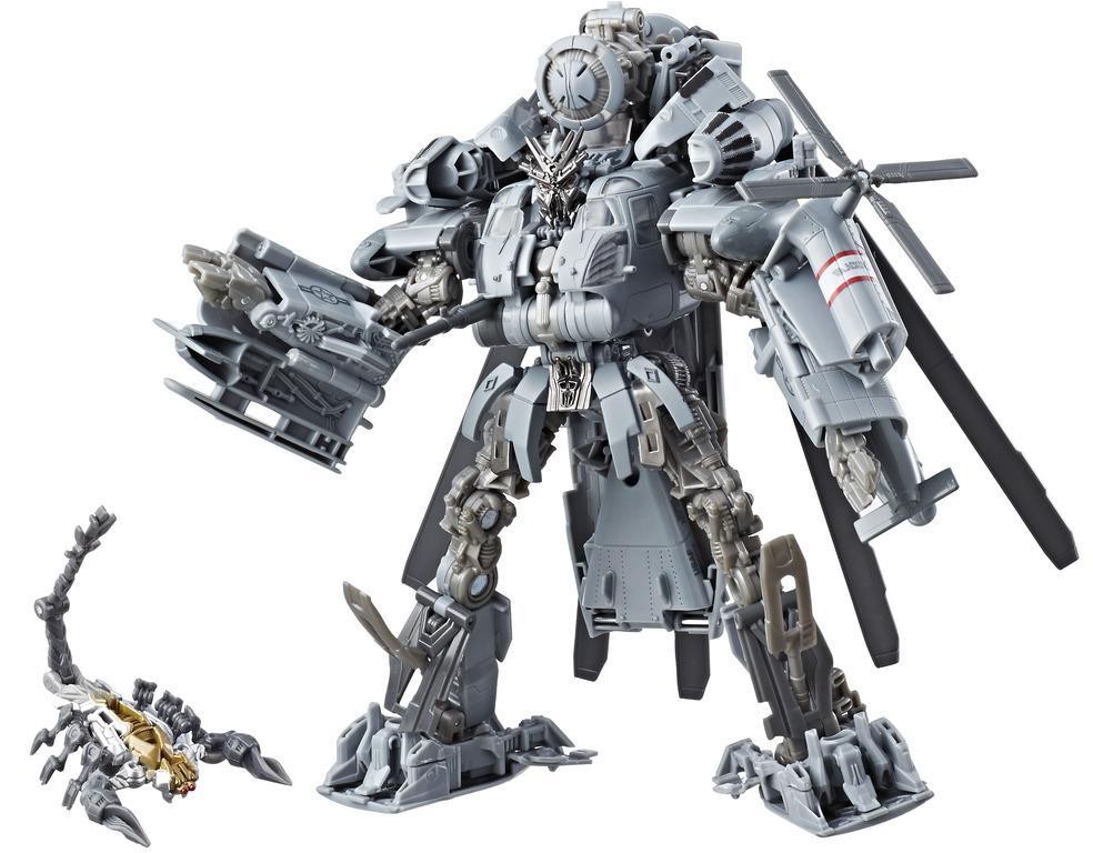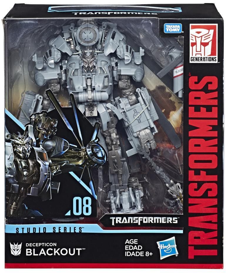 This Studio Series 08 Leader Class Movie 1 Decepticon Blackout figure converts between robot and helicopter modes in 23 steps and comes with 2 weapon accessories. Remove backdrop from pack to showcase the massive Decepticon hunter in the Desert Base Assault scene.