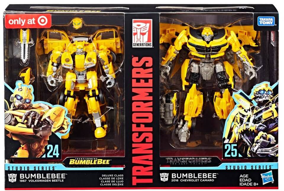 Includes Transformers Studio Series 24 Deluxe Class 1967 VW Beetle Bumblebee figure, Studio Series 25 Deluxe Class 2016 Camaro Bumblebee figure, 4 accessories, 2 removable backdrops, and instructions.
