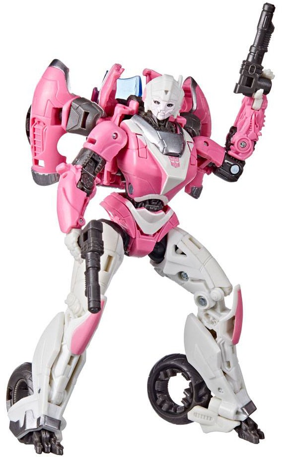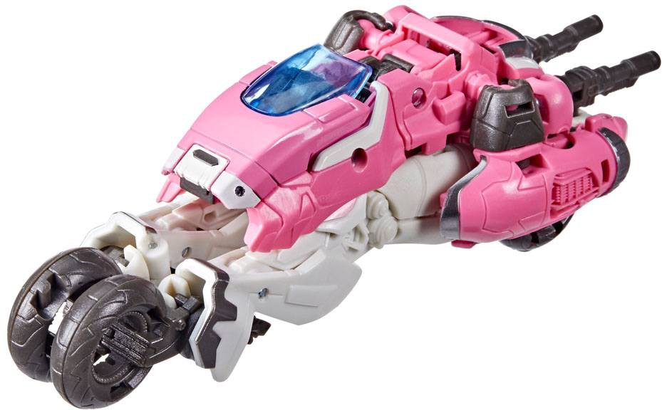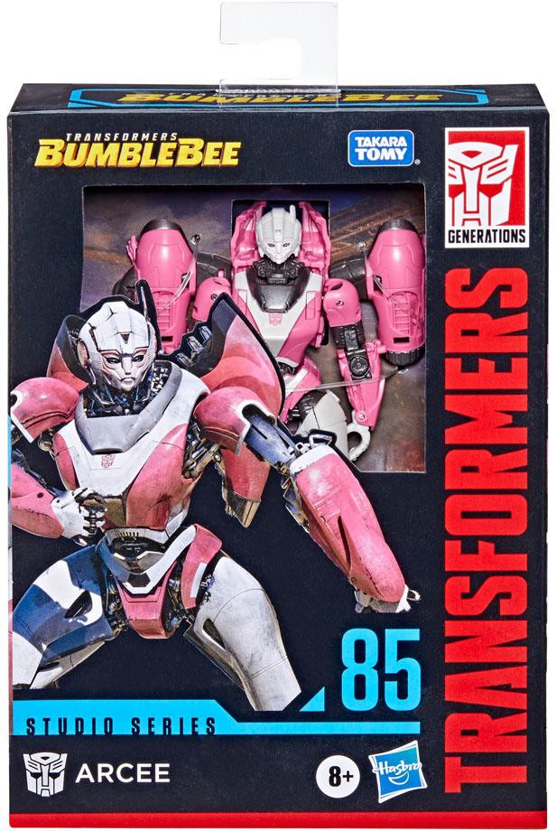 Denna Studio Series 85 Deluxe Class Transformers: Bumblebee-inspirerade Arcee-figur konverterar från robot till Cybertronian motorcykel i 23 steg. Levereras med två blastertillbehör som kan fästas i båda lägena.