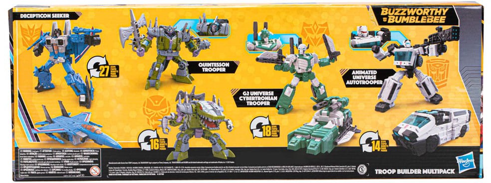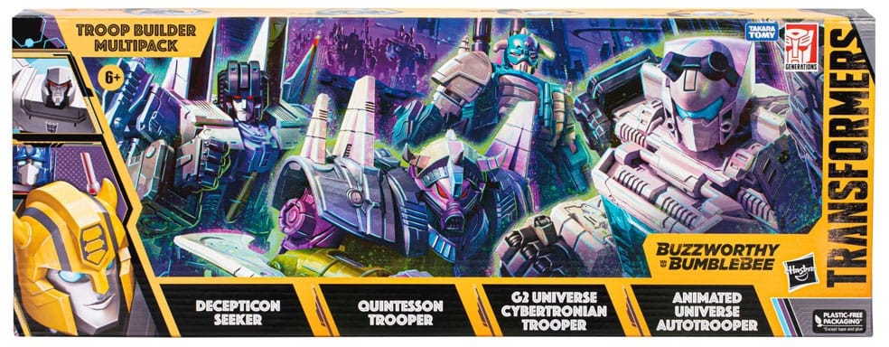 Prepare for an epic battle between the strongest Transformers robot troops with the Troop Builder Multipack! This pack includes 4 Transformers action figures: Decepticon Seeker, Quintesson Trooper, G1 Universe Cybertronian Trooper, and Animated Universe Autotrooper. Each figure converts from robot to their classic alt modes in 14-27 steps. Gear up your figures for combat with the character-inspired weapon accessories and the 3 included alternate heads for the Quintesson Trooper, G2 Universe Cybertronian Trooper, and Aniamted Universe Autotrooper figures. You've probably heard the buzz, but Bumblebee is kind of a big deal. And now the bodacious bot is making his mark with a line of some of the most buzzworthy Bumblebee products for fans of all ages. Buzzworthy Bumblebee figures feature collectible special packaging themed to fit the Buzzworthy Bumblebee line.