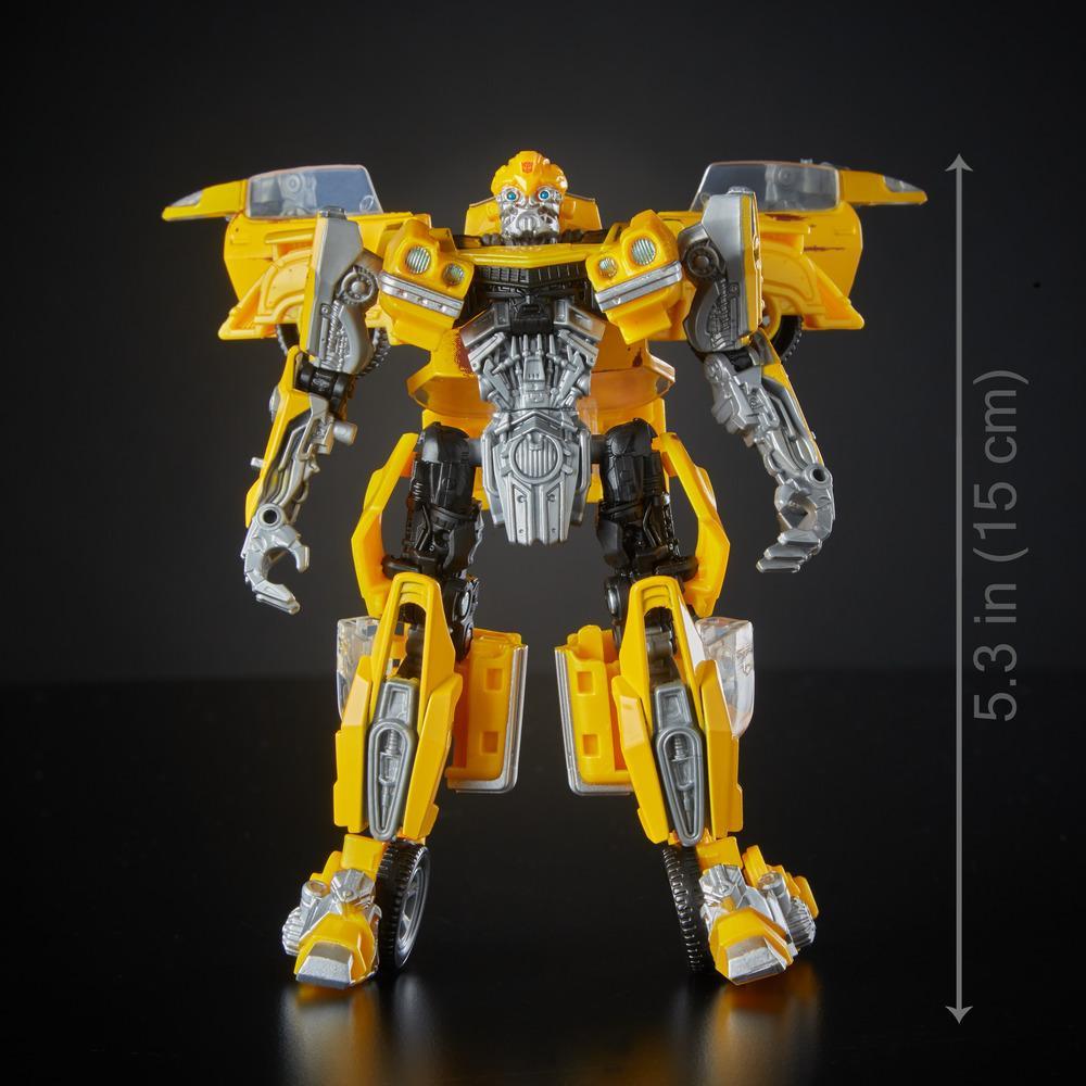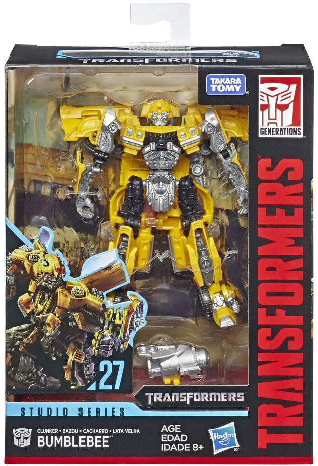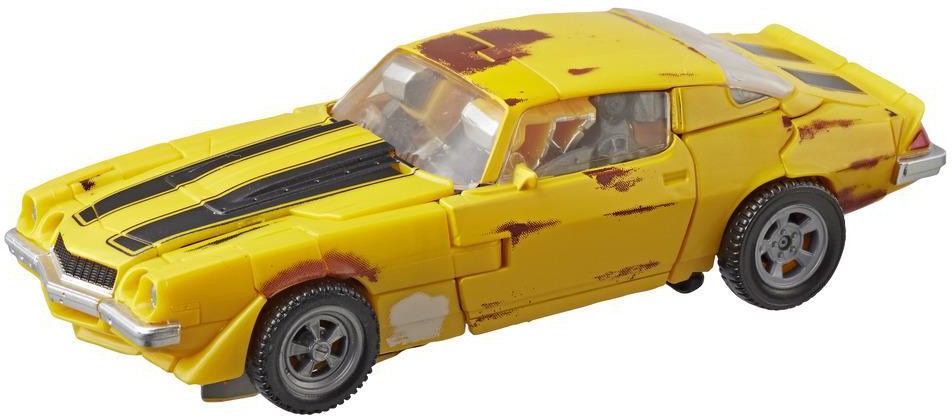 This Studio Series 27 Deluxe Class Transformers Movie 1 Clunker Bumblebee figure converts from robot to Chevrolet Camaro car mode in 22 steps. Remove backdrop to showcase Clunker Bumblebee in the Used Car Shopping scene. Figure features vivid, movie-inspired deco and includes a detailed weapon accessory, a blaster modeled after the weapon Bumblebee uses in the film.