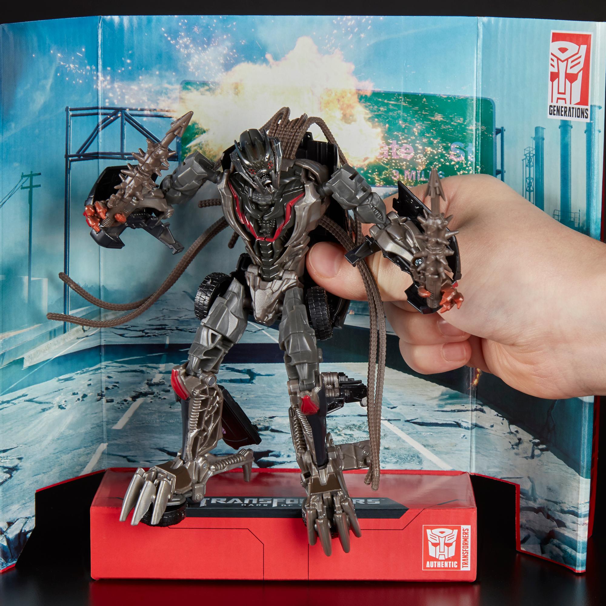 Approaching incognito as law enforcement, the “Dreads” convert into vicious destroyers in the High Speed Chase from Transformers: Dark of the Moon. Crowbar accelerates towards the Autobots to overtake them as they battle down the highway. With optics dead set on Sam Witwicky, he unleashes chaos until the explosive standoff against the Autobots.