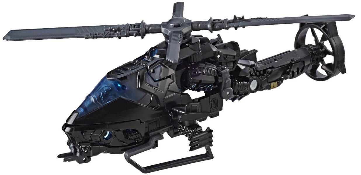 At the sight of Optimus Prime, Autobot Drift dives gracefully off a cliff, converting midair into his helicopter mode to meet him.