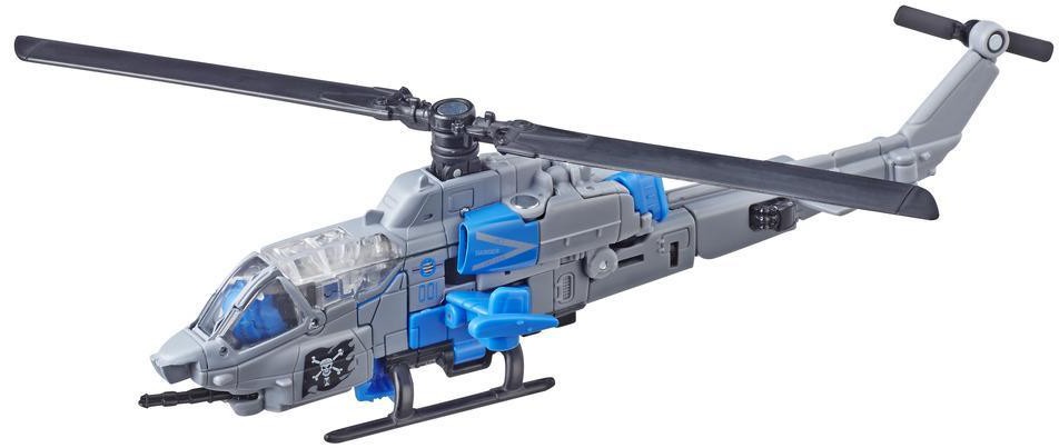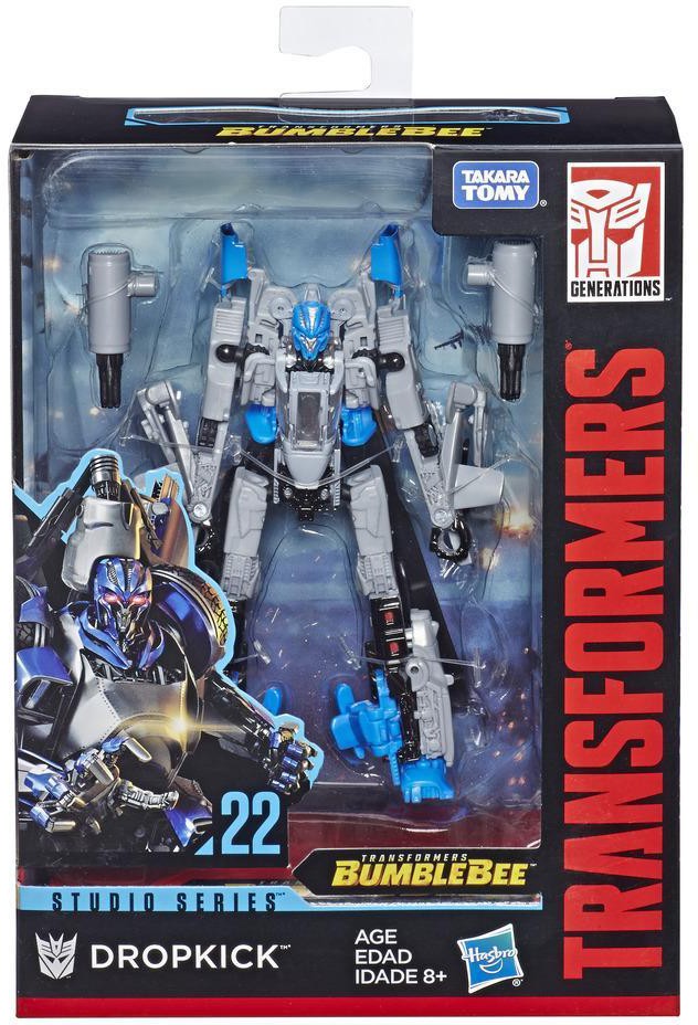 This Studio Series 22 Deluxe Class Transformers: Bumblebee Dropkick figure converts from robot to Bell Helicopter mode in 24 steps and comes with 2 accessories. Remove backdrop to showcase Dropkick in the Autobot Pursuit scene.
