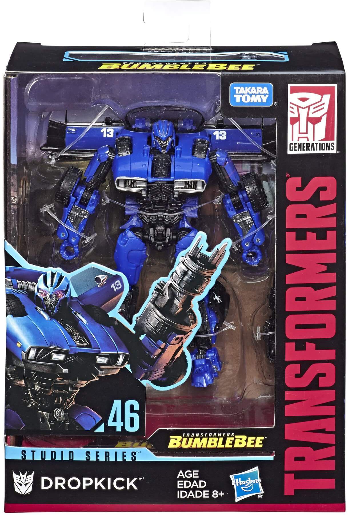 This Studio Series 46 Deluxe Class Transformers: Bumblebee Dropkick figure converts from robot to car mode in 26 steps. Remove backdrop to showcase Dropkick in the Decepticon Arrival scene. Figure features vivid, movie-inspired deco and detailed accessory.