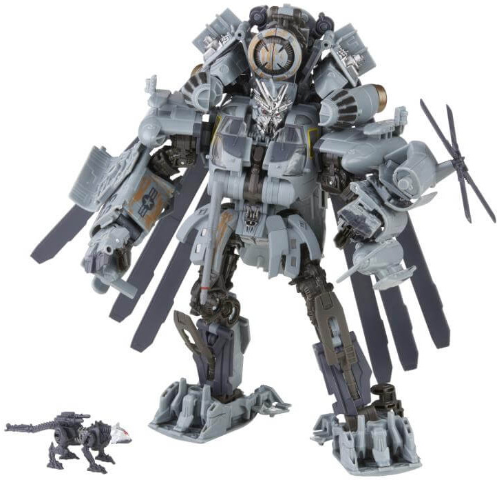 This Studio Series 73 Leader Class Transformers: Revenge of the Fallen-inspired Grindor figure converts from robot to Sikorsky helicopter mode in 46 steps. In the Forest Fight scene, fighting Optimus Prime proves to be a headache for Grindor as the Autobot leader tears his head in two. Includes shoulder blade accessory and non-converting Ravage. Remove backdrop to showcase Grindor in the Forest Fight scene.