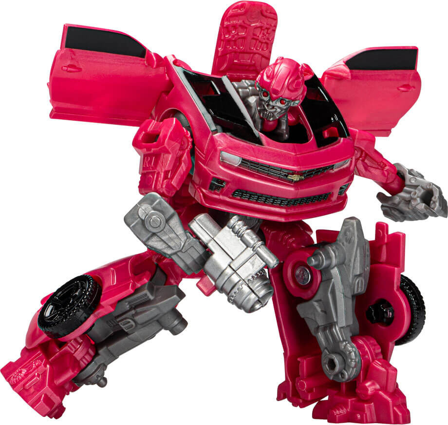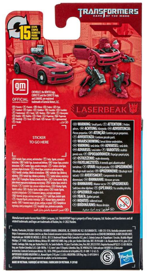 This Studio Series Core Class Transformers: Dark of the Moon-inspired Laserbeak figure stands at 3.5 inches and converts from robot to licensed Camaro mode in 15 steps. Comes with a blaster accessory that attaches in both modes. This 3.5-inch Laserbeak figure makes a great gift for kids and adults!