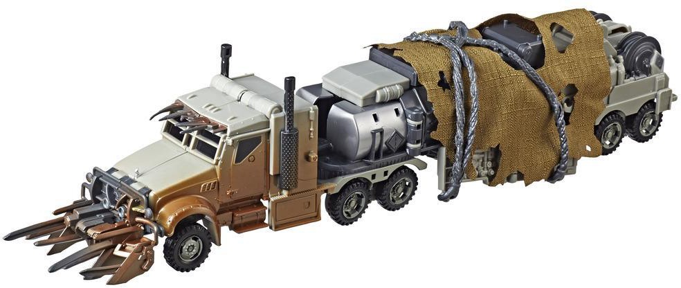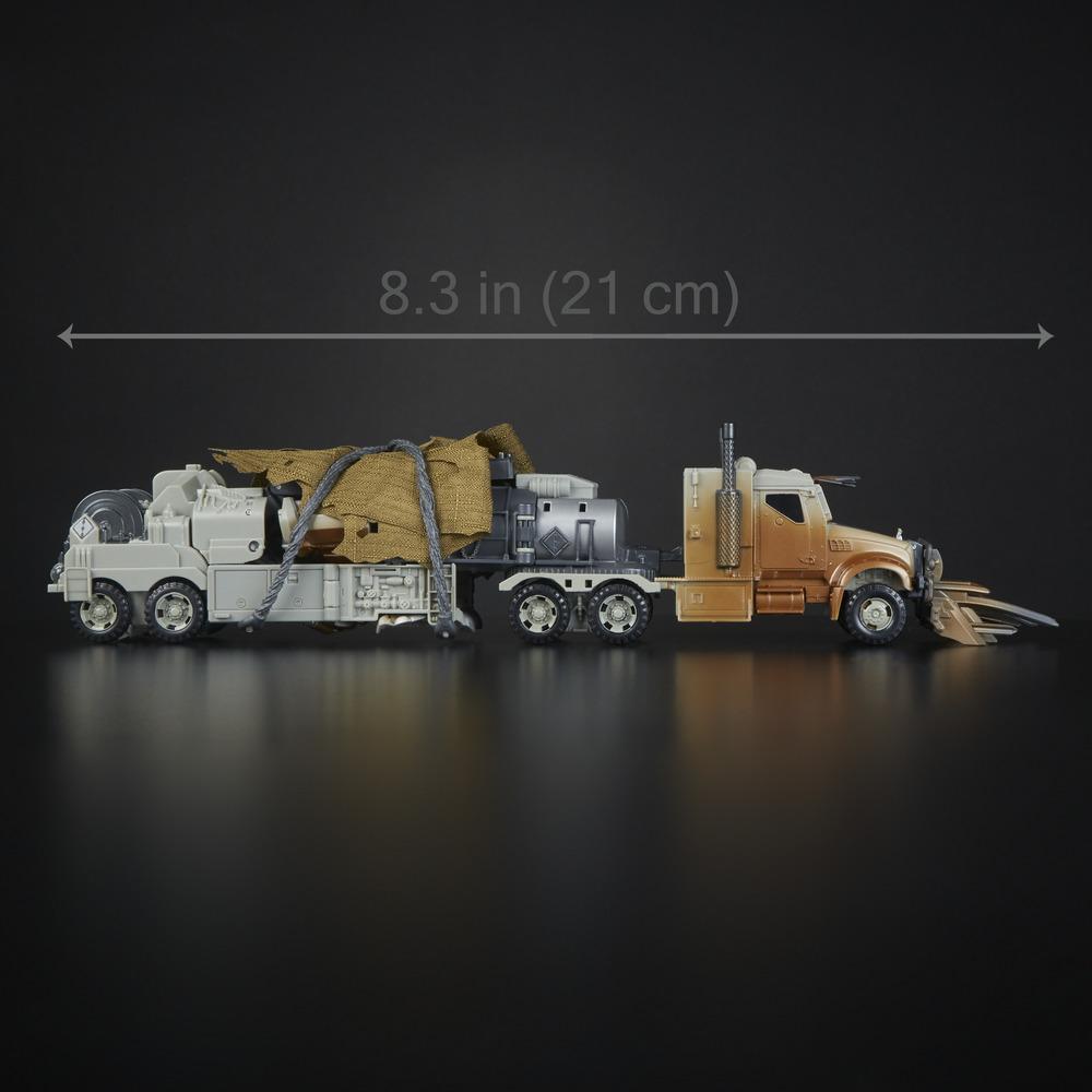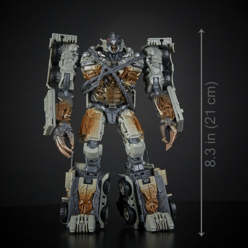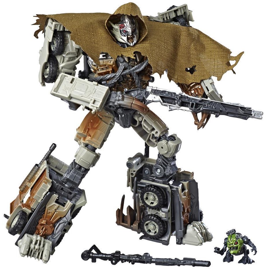 This Studio Series 34 Voyager Class Megatron figure features vivid, movie-inspired deco and converts from robot to Mack truck mode in 30 steps. Remove backdrop to showcase Megatron and the little green Igor minion figure in the Serengeti Hideout scene. Includes 3 detailed accessories, including cape, blaster, and removable chains accessories modeled after the ones Megatron uses in the film.