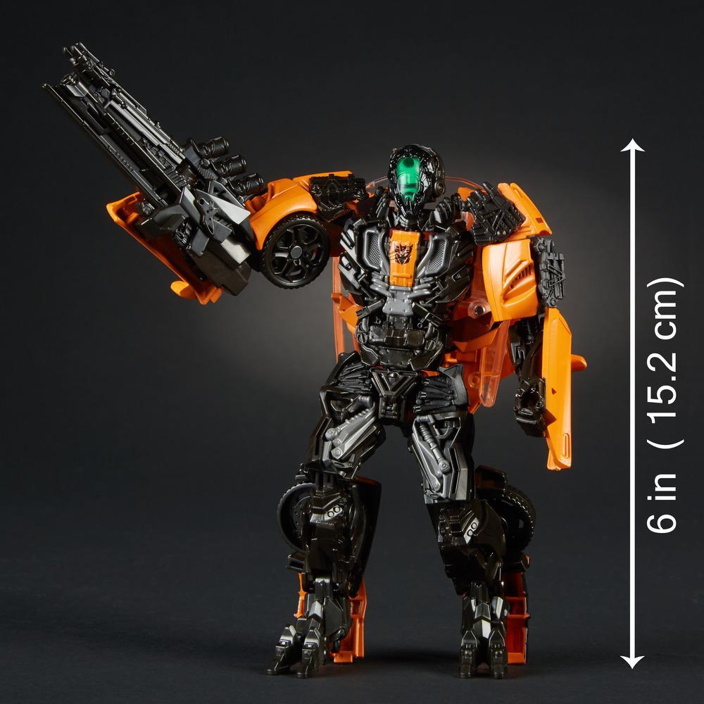 This Studio Series 17 Deluxe Class Transformers: Age of Extinction Shadow Raider figure converts between robot and Lamborghini modes in 14 steps and comes with a detailed weapon accessory. Remove the backdrop from pack to showcase the faceless Decepticon mercenary in the Enemy Ship Infiltration scene.