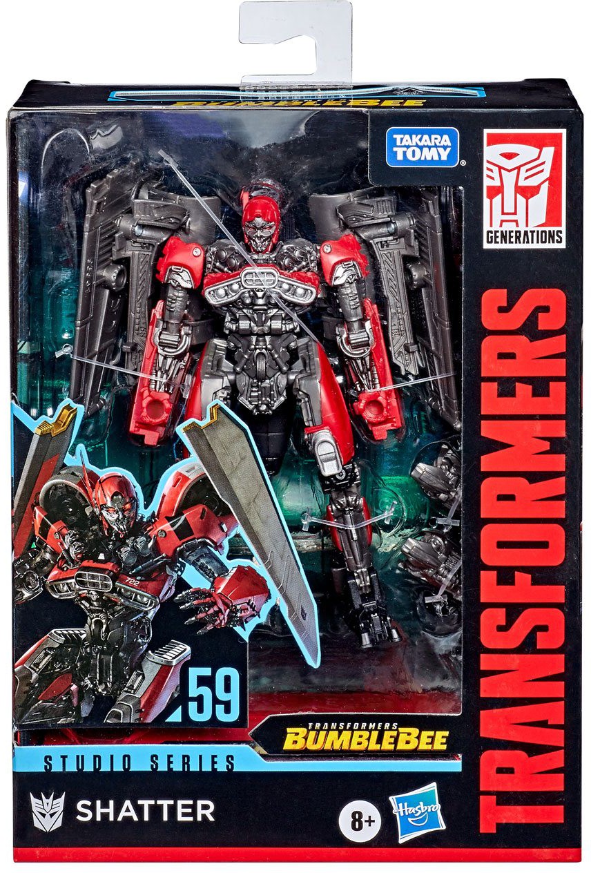 This Studio Series 59 Deluxe Class Shatter figure features vivid, movie-inspired deco and converts from robot to jet mode in 27 steps. Remove backdrop to showcase Shatter in the Sector 7 Deception scene. Includes 2 detailed weapon accessories.
