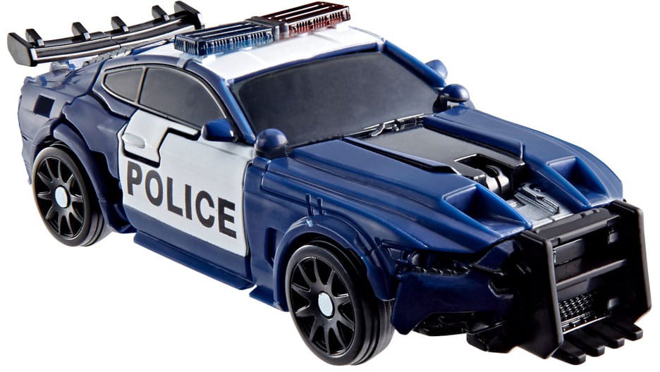 The 4.5-inch (11 cm) figure converts from robot action figure to officially licensed Ford Mustang police car mode in 23 steps.