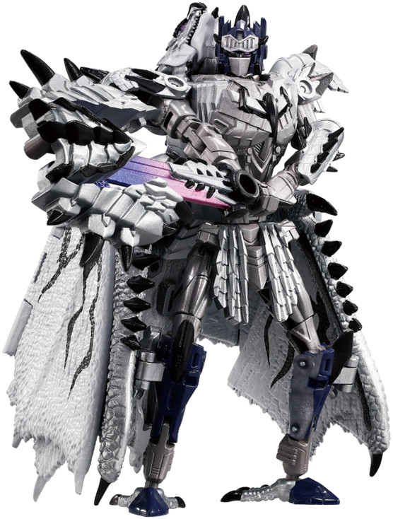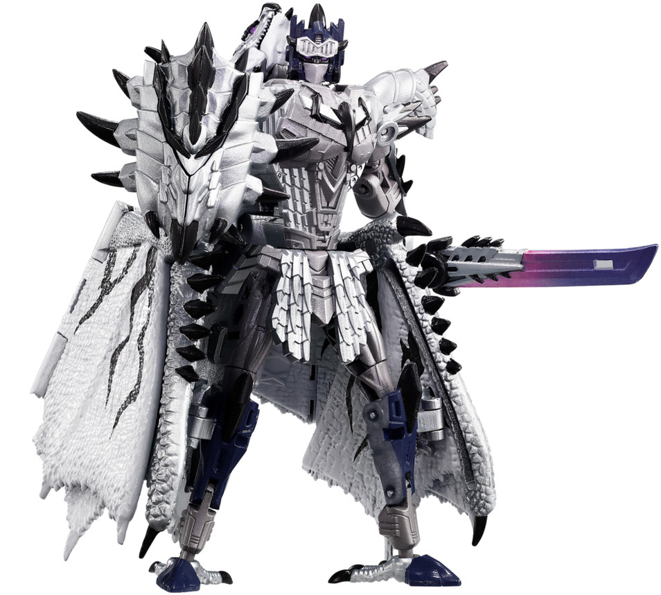 Denna samlarfigur kan omvandlas från en silverfärgad Optimus Prime-robot till ett wyvern-liknande monster.