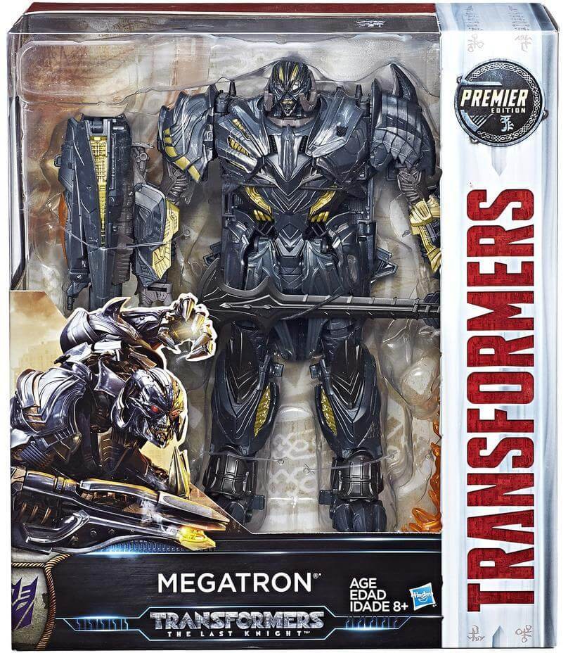 Transformers: The Last Knight Premier Edition Leader Class figures stand at a 9-inch-scale with eye-catching detail. Change this Leader Class Megatron figure between robot and jet modes in 30 steps. Premier Edition lineups include iconic movie characters so fans can join in epic Transformers action.