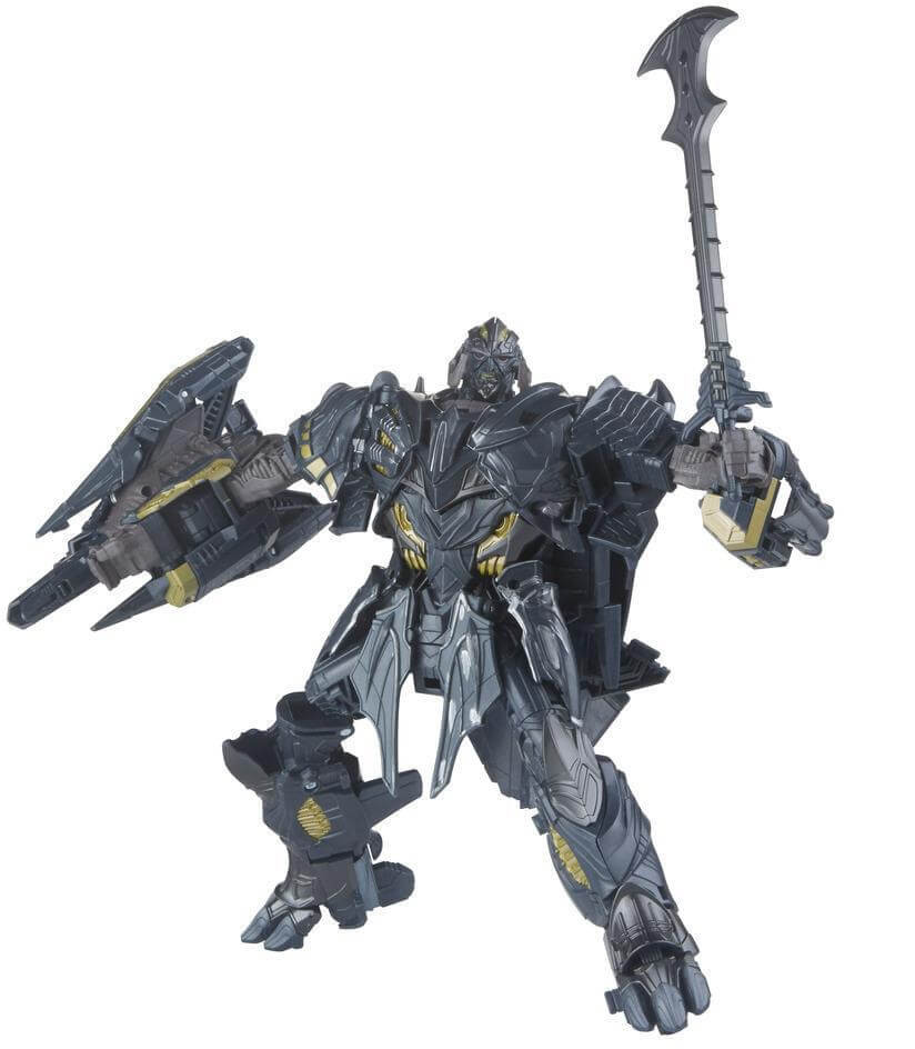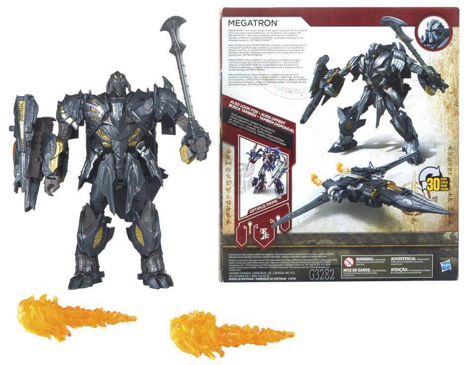 Includes Transformers: The Last Knight Premier Edition Leader Class Megatron figure, 3 accessories, and instructions.