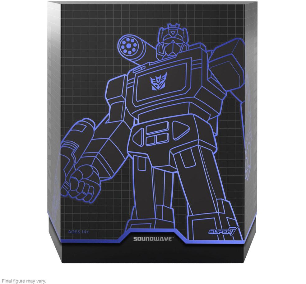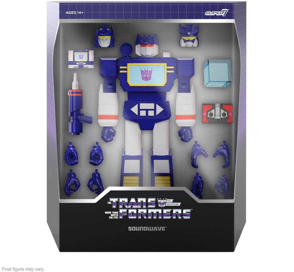 18 cm hög Soundwave G1 ULTIMATES!-actionfigur baserad på karaktärens G1utseende. Kommer med utbytbara huvuden, händer samt tillbehör.