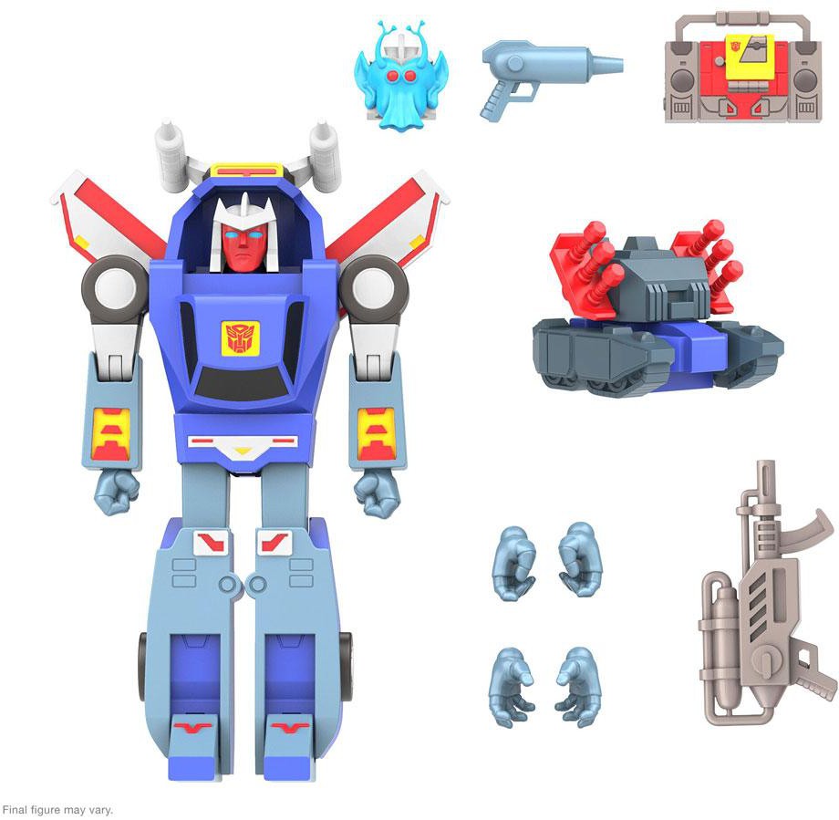 Tracks is totally awesome! Just ask him, he'll tell you! Considering that his non-robot transformations are a sports car AND a jet plane, it's kinda hard to argue with him. The Transformers ULTIMATES! figure of Tracks features G1 accurate paint deco and interchangeable heads and hands, measuring in at 7.5" in height when fully equipped with his wings and missiles. With an arsenal of weapons and other accessories inspired by both the cartoon and the vintage toy, this Autobot diva is equipped to the nines! Love to hate him or hate to love him, either way, he's a key member of the Autobots- and seeing that he once risked his life defending San Francisco, he's near and dear to Super7's heart.
