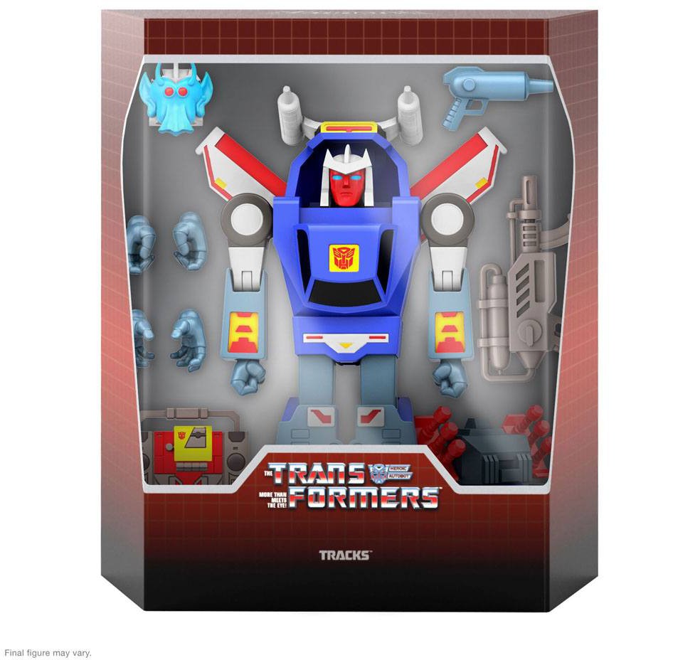 Transformers ULTIMATE! figure Tracks har utbytbara huvuden och händer, som mäter 7,5 "i höjd när de är fullt utrustade med sina vingar och missiler. Med en arsenal av vapen och andra tillbehör inspirerade av både tecknad film och vintage -leksaken.